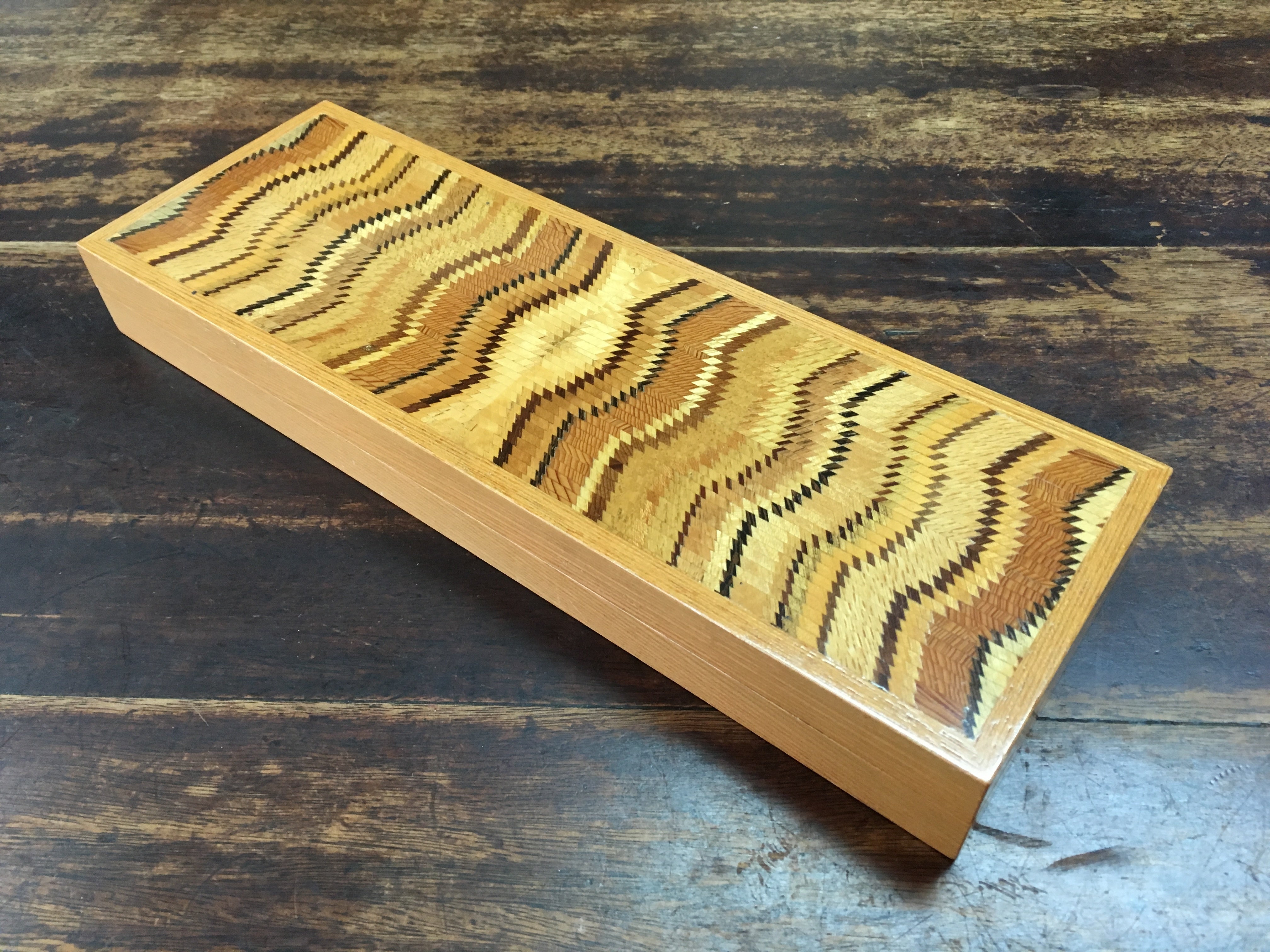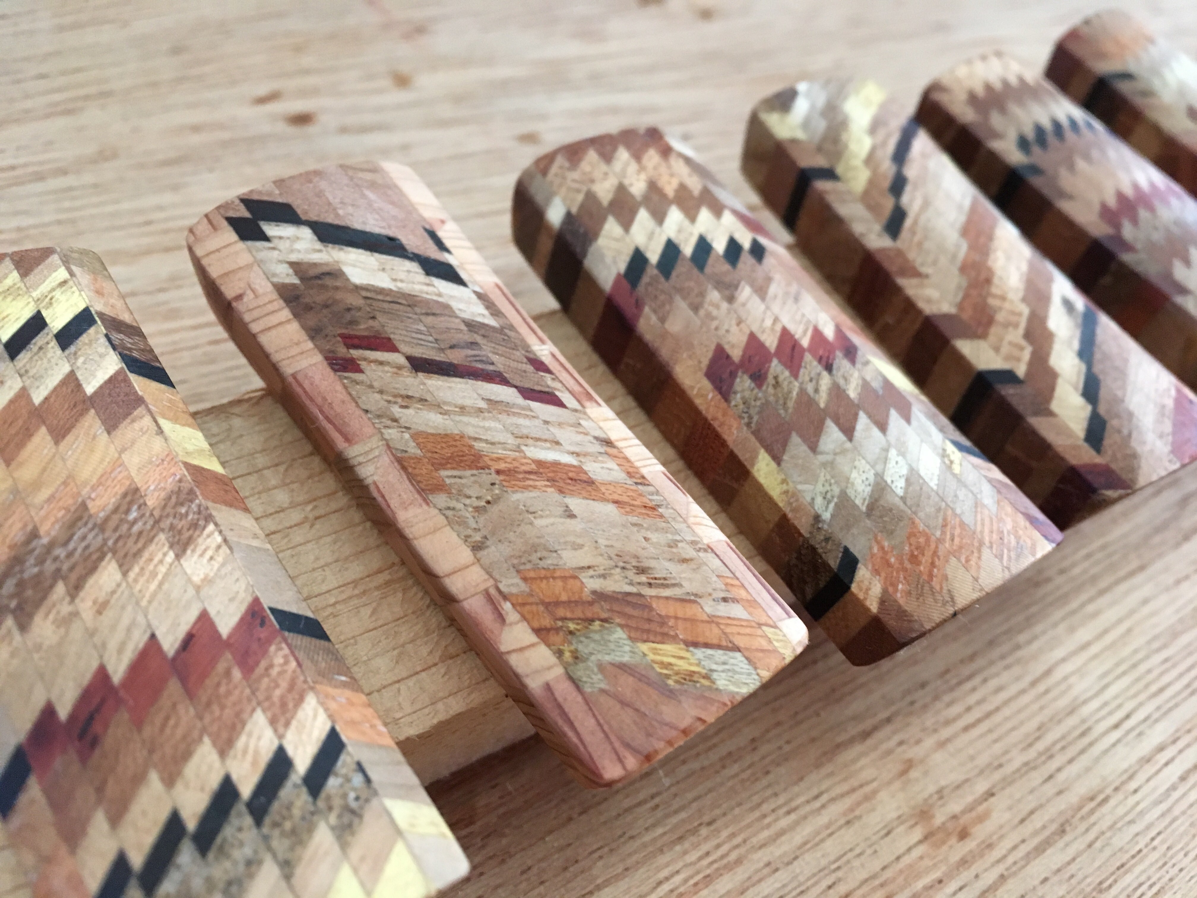 現在では貴重になった国産材大径木や銘木を隅々まで無駄なく使うために、当工房では端材を使った独自の寄木細工、「木彩」により、家具・アクセサリー等の制作を行っております。