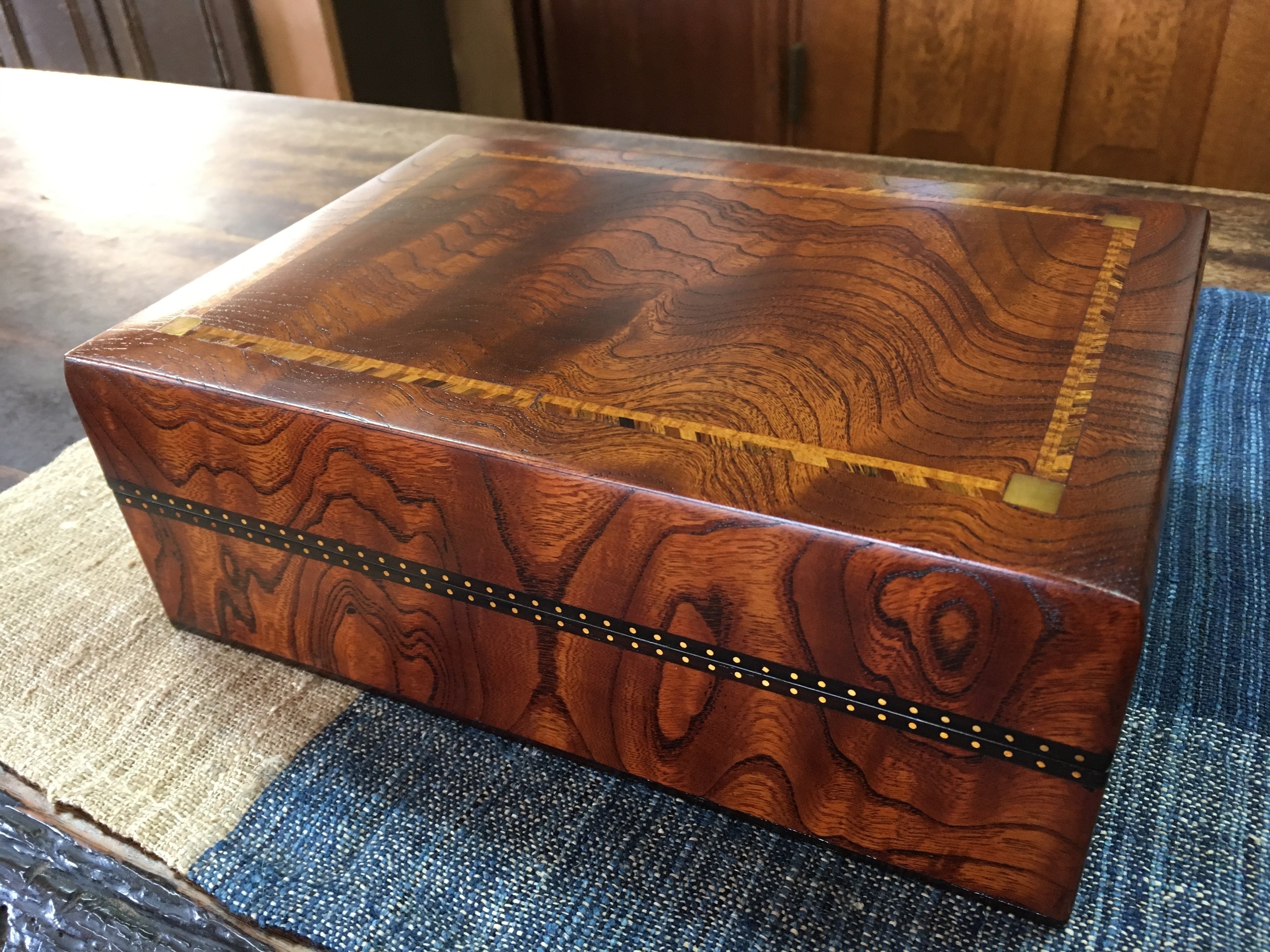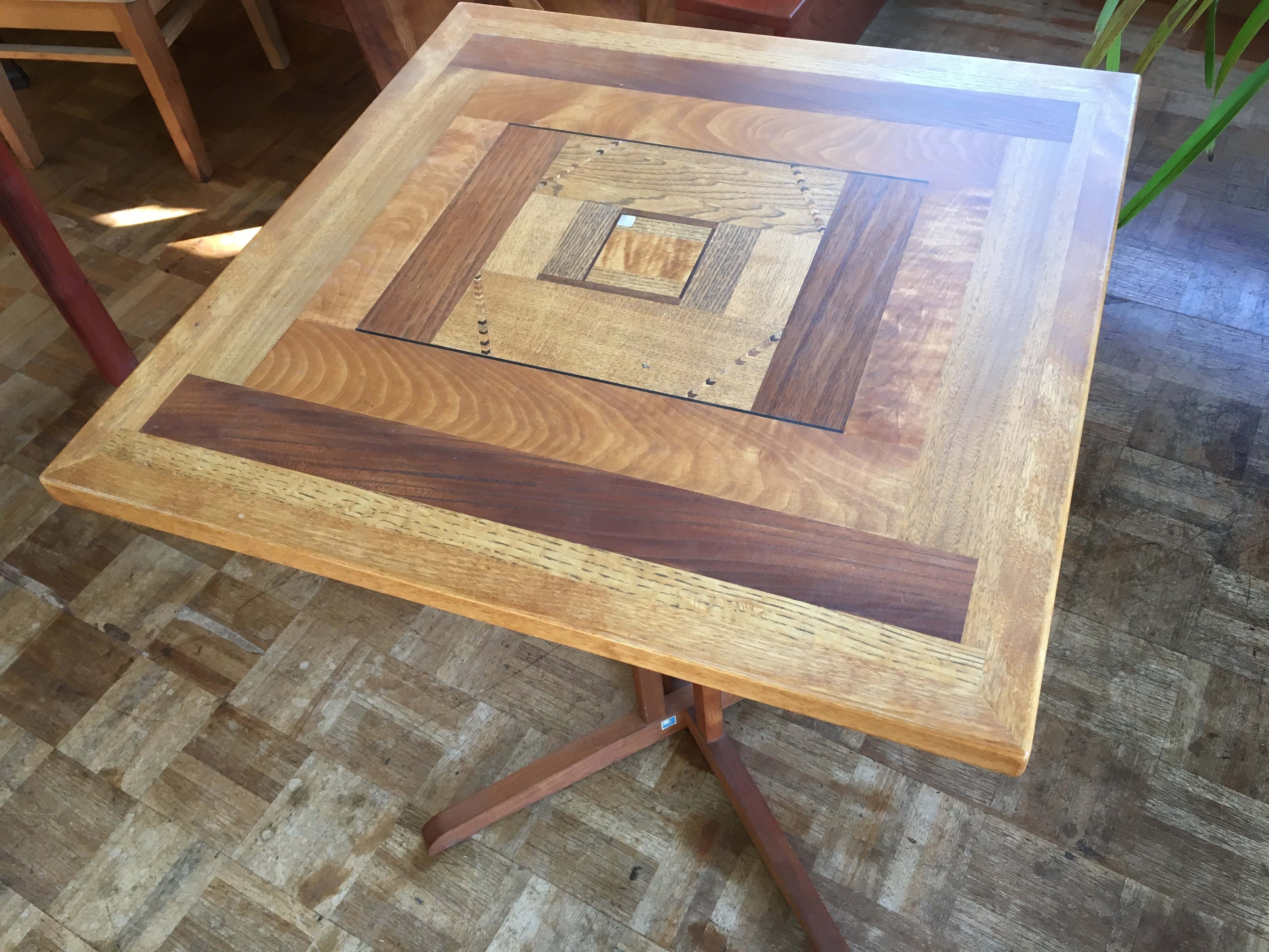 ●天板は様々な木を組み合わせて紋様を作り出しています。さらに木彩の象嵌、夜光貝の象嵌、脚の部分にも杢彩の象嵌等オリジナルのスタイル。ひと時の寛ぎに如何でしょうか。