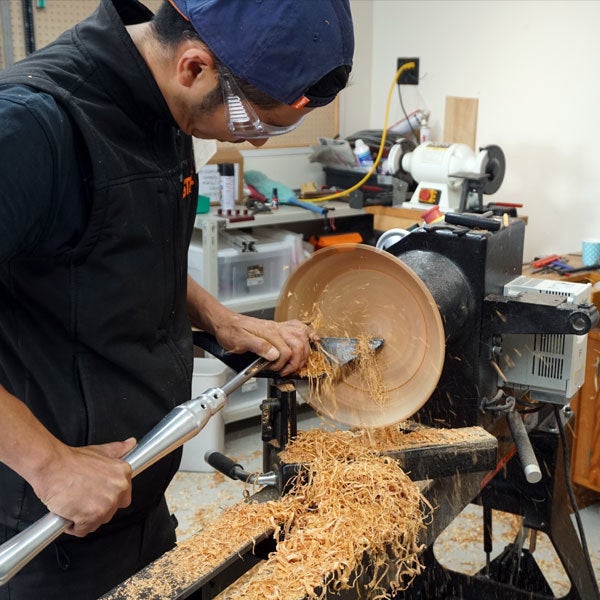 焼き物の成形に使うろくろに似た機械で、高速で回転させた木材にノミなどの刃物を当てることで、コップ、丸皿、円形の作品を削り出したり、スプーンのくぼみを削ることができます。