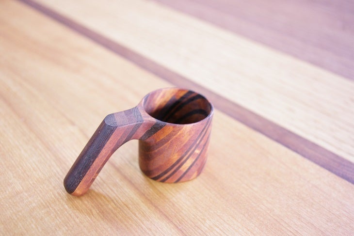 クロサキ工芸では休憩時間にコヒーの豆をミルで挽いています。電動では早く引く事が出来ますが手回しで香りを楽しみながら引きますと、お客様をが引きたいとご自分でミルを引き楽しみながら、コヒータイムを味わって戴いております。 このコヒーの豆を測るカップや、お酒を飲むぐい飲みなども木工旋盤で作る事が出来ます。今迄と違いクロサキ工芸の制作範囲が広がり、身近なカトラリーや子供のおもちゃ等に活用出来ますのでどうぞ皆様の御支援宜しくお願い致します。