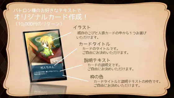 こびと人狼カードを1枚選んでいただき、そのカード名や説明文をパトロン様のお好きなように変更したオリジナルカードを作成いたします。