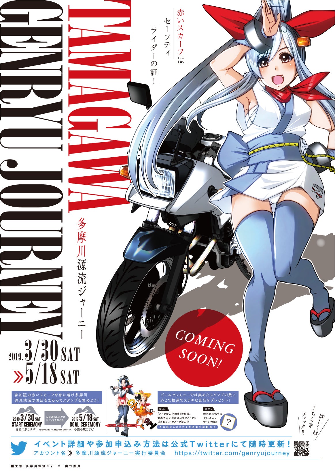 本イベントに参加する方には、イメージキャラクターの女の子「GSX400Sカタナちゃん」が首に着けているような赤いスカーフを参加証ということで着けて頂き、安全運転していることをアピールしながら交通安全の啓発活動にご協力して頂きたいと思っております。