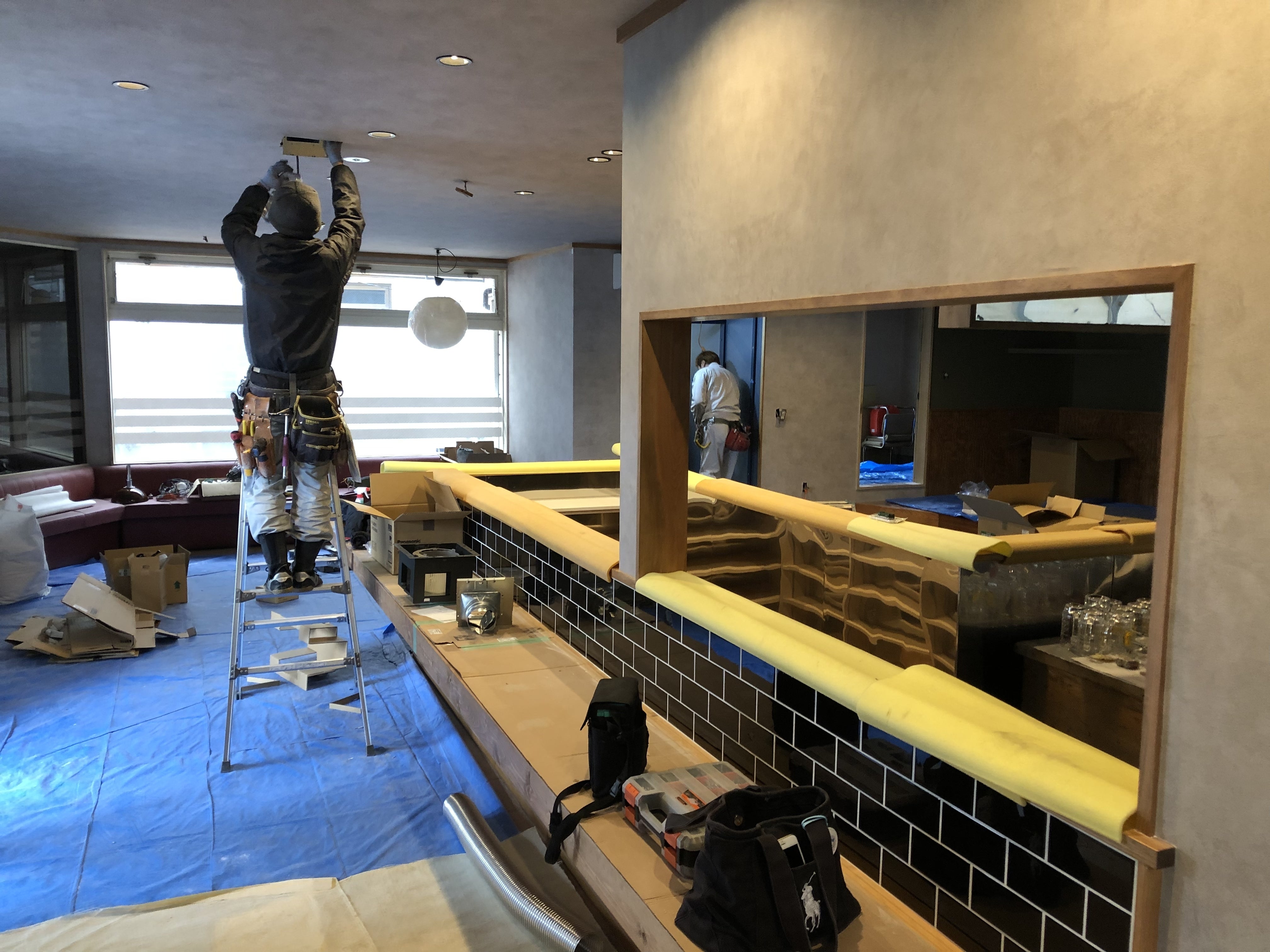 ギャンブルの漫画は好きだけどギャンブルは一切やらない、当プロジェクト広報のジンボラボ 神保貴雄です。一番好きなのは「哲也ー雀聖と呼ばれた男」の印南というキャラだよ(笑)さて、さきほど「NEWほんだや」を偵察に伺いました。かなぁ〜り、出来上がってきましたね。トイレなんてピッカピカでまだビニール袋に包まれてましたから(笑)。ということで、その一部始終を紹介します。コの字カウンターがお店のど真ん中に鎮座。いよいよって感じですね!もう薄っすら生ビールが見えるのは僕だけでしょうか(笑)。街の人々も注目してくれています。入り口の上に「瓦」みたいなオブジェが設置されました。人が出入りするだけでも建物が喜んでいる感じがしますね!おったのしみにんっ(^−^)