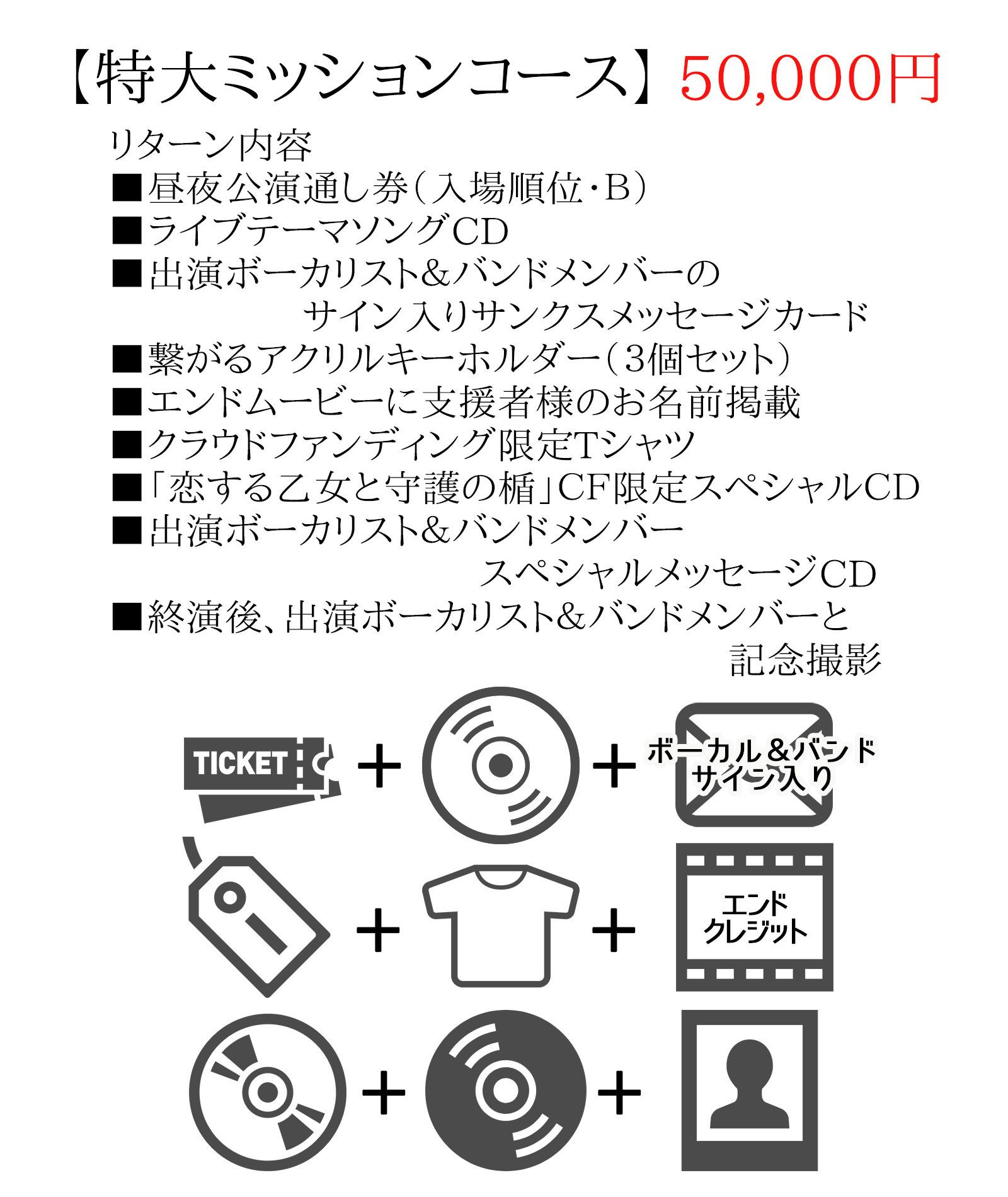 1支援につき1回、昼夜どちらかの終演後に出演ボーカリスト&バンドメンバーと支援者の方で記念撮影をいたします。どちらの回の終演後かは、チケットに記載しますので、必ず最後まで無くさぬようお願いいたします。