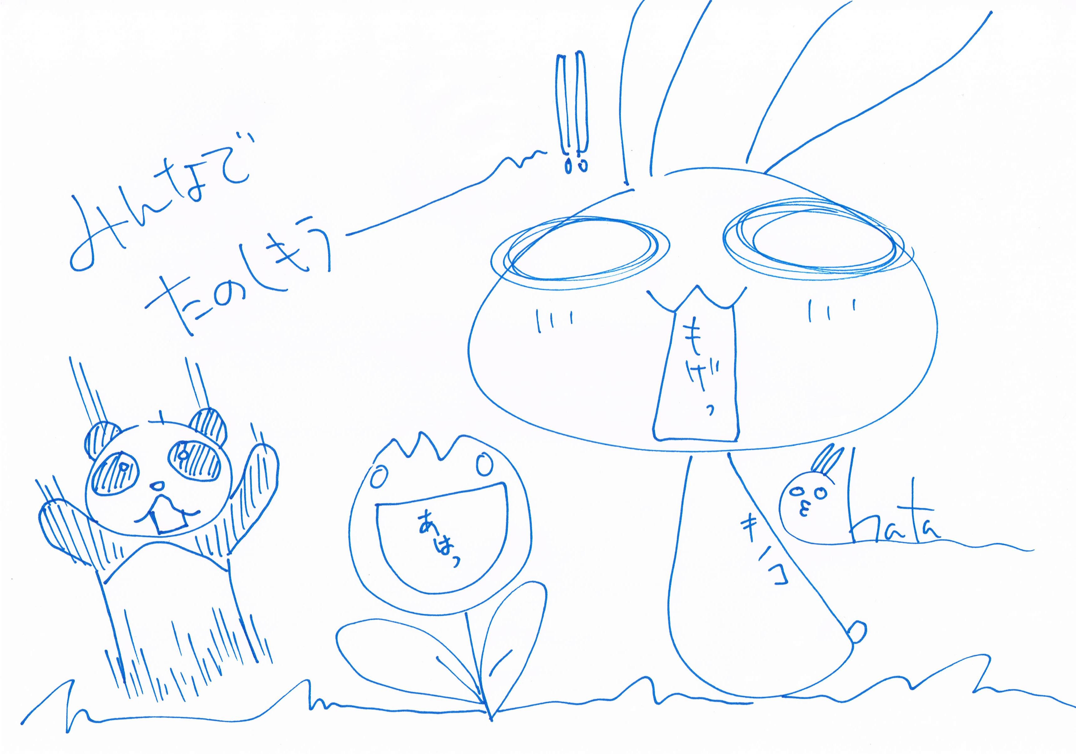 ウサギキノコ(茶太さんのマスコット。目が空洞のウサギの形をしたキノコ)はもちろん、個人的には隣のはなちゃん(チューリップ。ってか、正式名称合ってたっけ!?)がとても好きで、必ず書いてもらっています(笑)