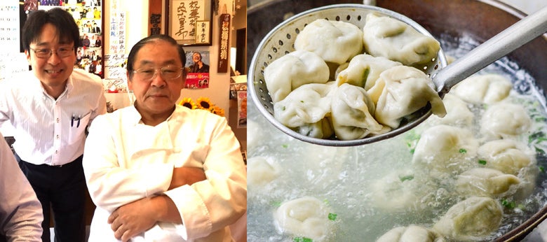 photo: (左)久保木 武行シェフと当社代表、(右)葉にんにく餃子