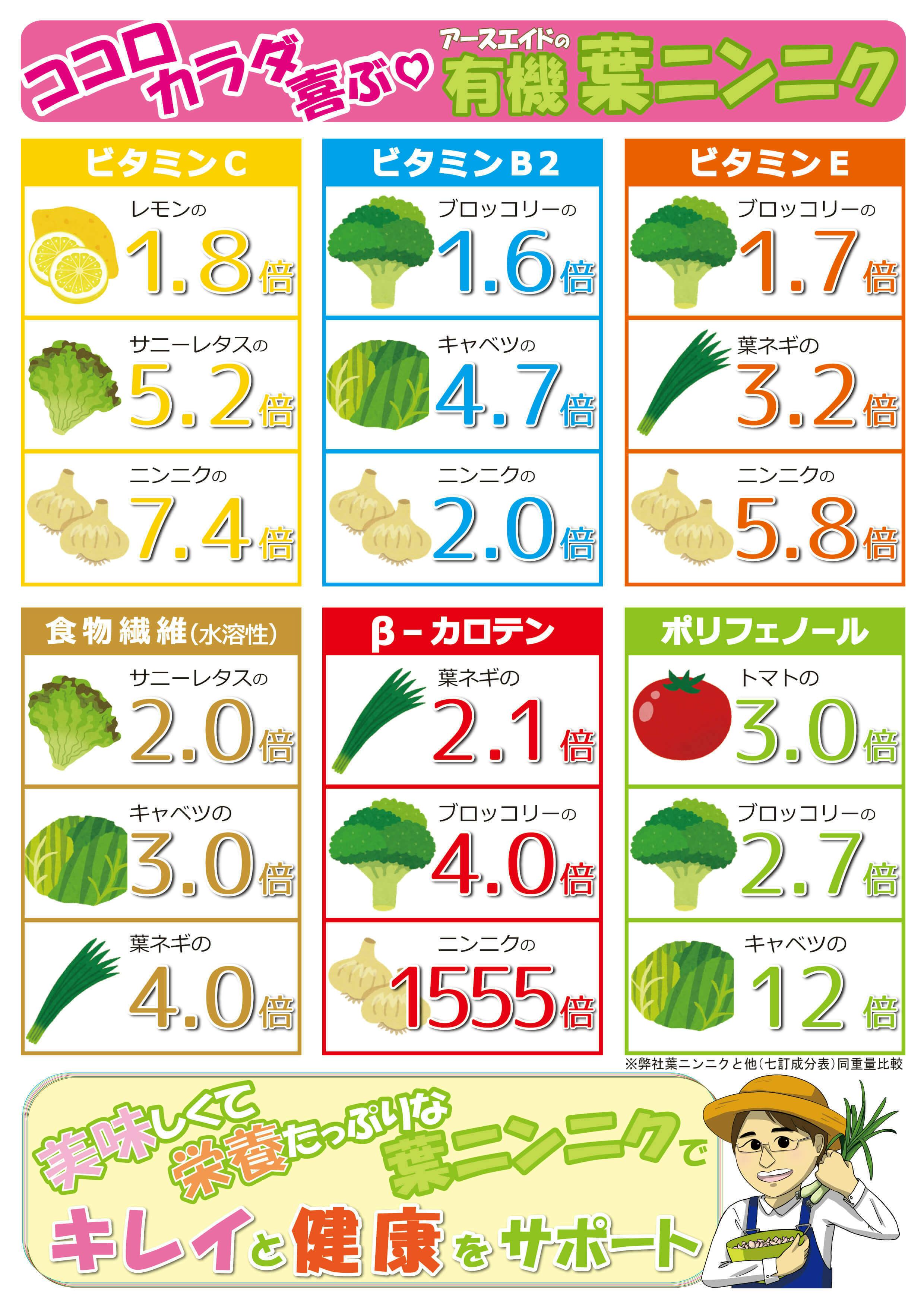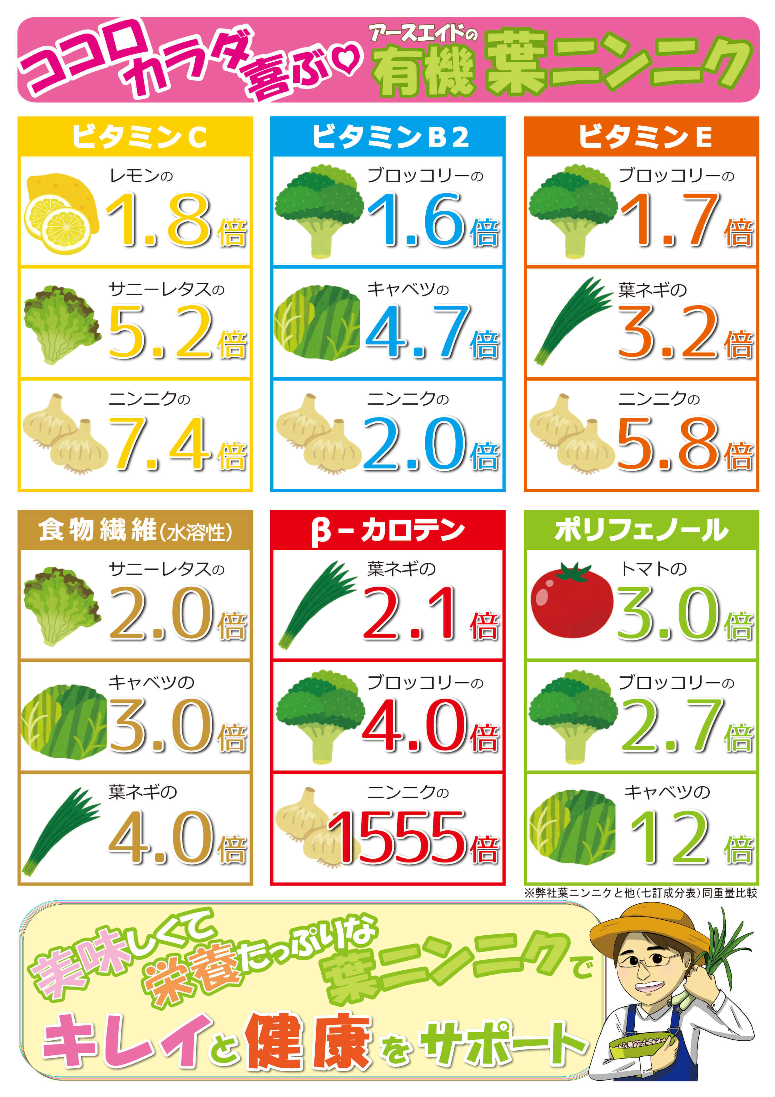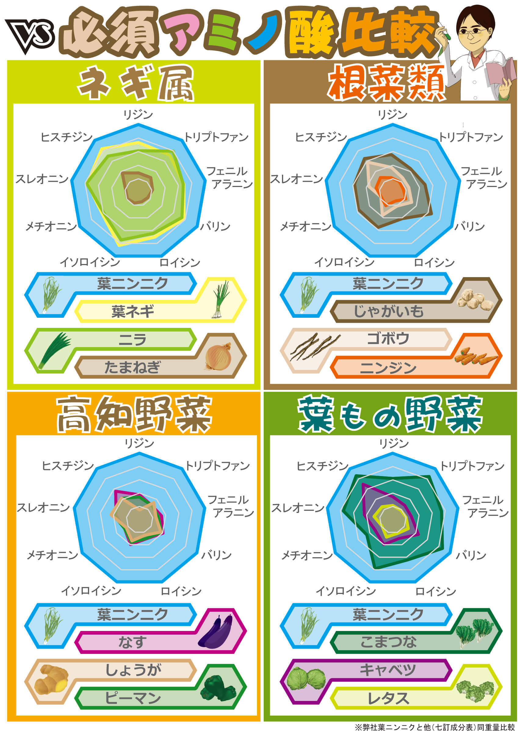 そして一流シェフから絶賛される味の裏付けとして、旨味成分である”アミノ酸”も当社の葉にんにくは豊富であることが分かりました。舌もカラダも悦ぶ野菜が葉にんにくなのです。