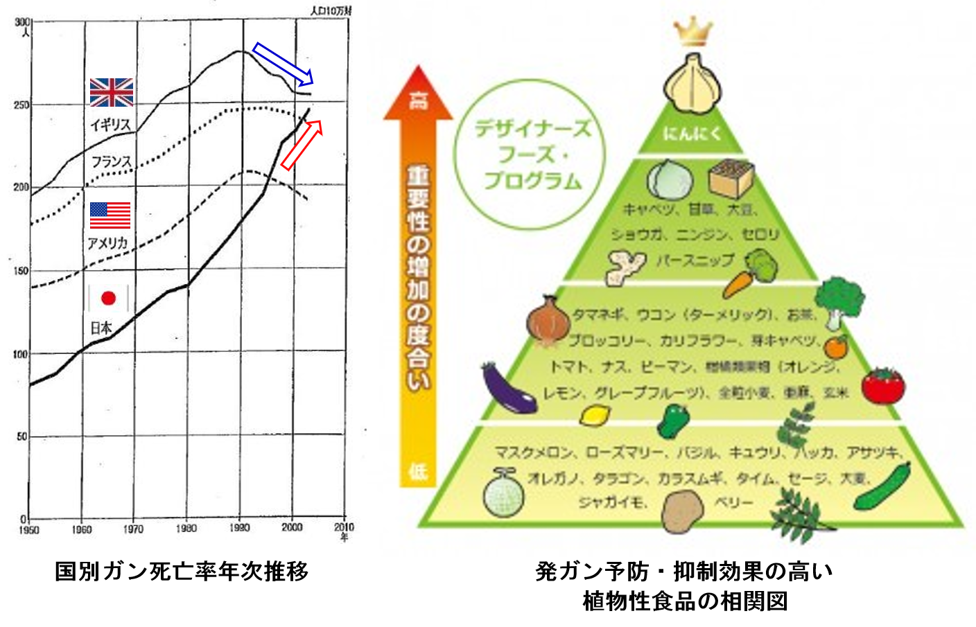 figure:デザイナーズフーズピラミッドと国別ガン死亡率年次推移