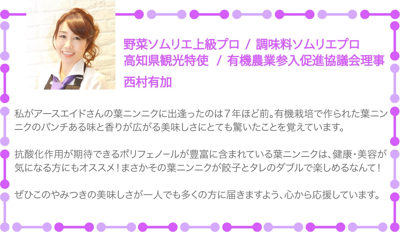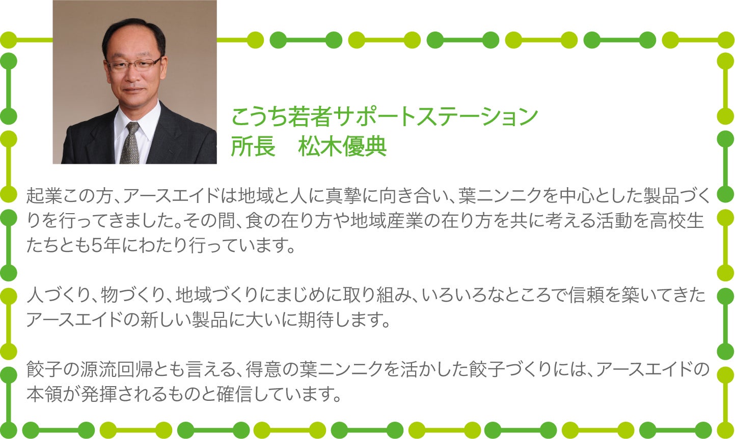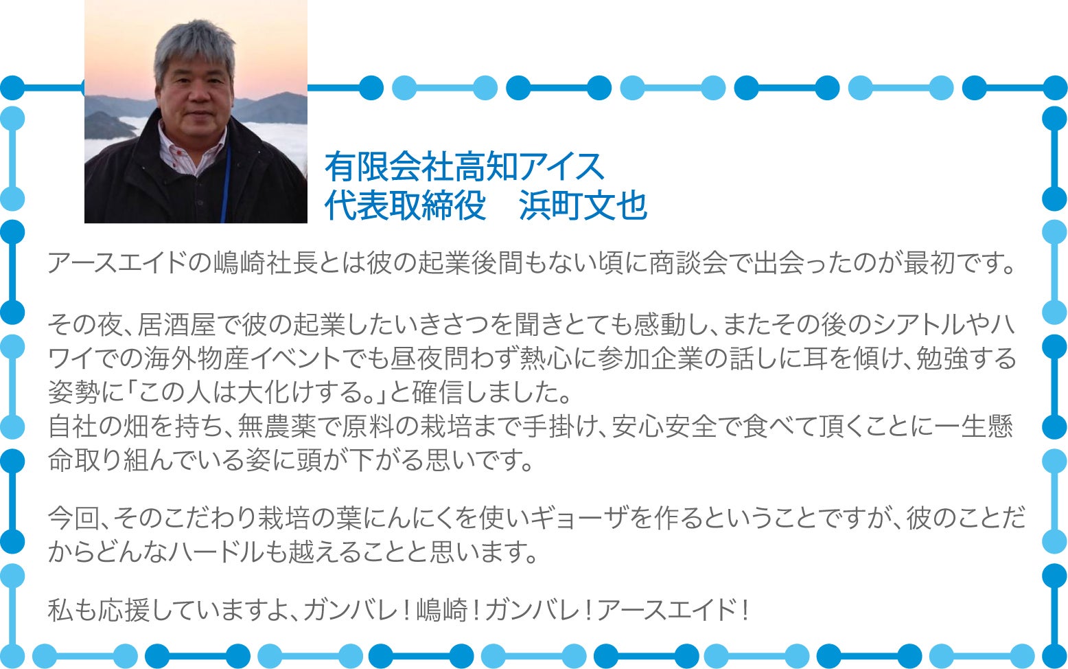 2019/10/03 13:39【ありがとうございました】リターンをお送りさせていただきました皆さまからのお声を参考に改善を重ねた結果、当初の予定より遅れてしまったものの製品化、販売を開始することができました!改めましてお礼申し上げます。※アースエイドHP 葉ニンニク餃子販売ページ【有機の葉ニンニクで作ったヘルシー餃子】製品化した葉ニンニク餃子はリターン品でお送りさせていただきましたものから比べると「葉ニンニクの量を抑えたこと」、「グルテンフリーの米粉皮に変更したこと」が大きな変更点です。葉ニンニクの量を少し抑えたことで、これまでに葉ニンニクを食べたことない人でも違和感なく葉ニンニクの風味や甘みを感じていただけます。またグルテンフリーの米粉皮にしたことで「焼き餃子」、「水餃子」どちらでもモチモチの食感を味わっていただくことができ、課題であった調理の難易度も大幅に改善されました。【つけダレも一から作り直しました】また当初は葉ニンニクのぬたをつけダレとして考えていましたが、餃子の仕様が変更になったことでつけダレも合わせて専用のものを一から試行錯誤し作りました。「利尻昆布」、「原木しいたけ」、「有機醤油」といった贅沢な素材を使い、「高知県産のゆず」を合わせることで上品でうま味のあるさっぱりとしたタレに仕上がっています。【ホームページからご購入いただけます】現在はホームページから購入いただくことが可能です。※アースエイドHP 葉ニンニク餃子販売ページ【一部店舗販売も致しております】・とさのさとアグリコレット( / 高知県高知市北御座10-10 / 営業時間:SHOP&テイクアウト10:00〜19:00 年中無休(元旦を除く)) ・アースエイド本店(/ 高知県須崎市浦ノ内西分2622 / 営業時間:平日8:30~17:00) もっと見る