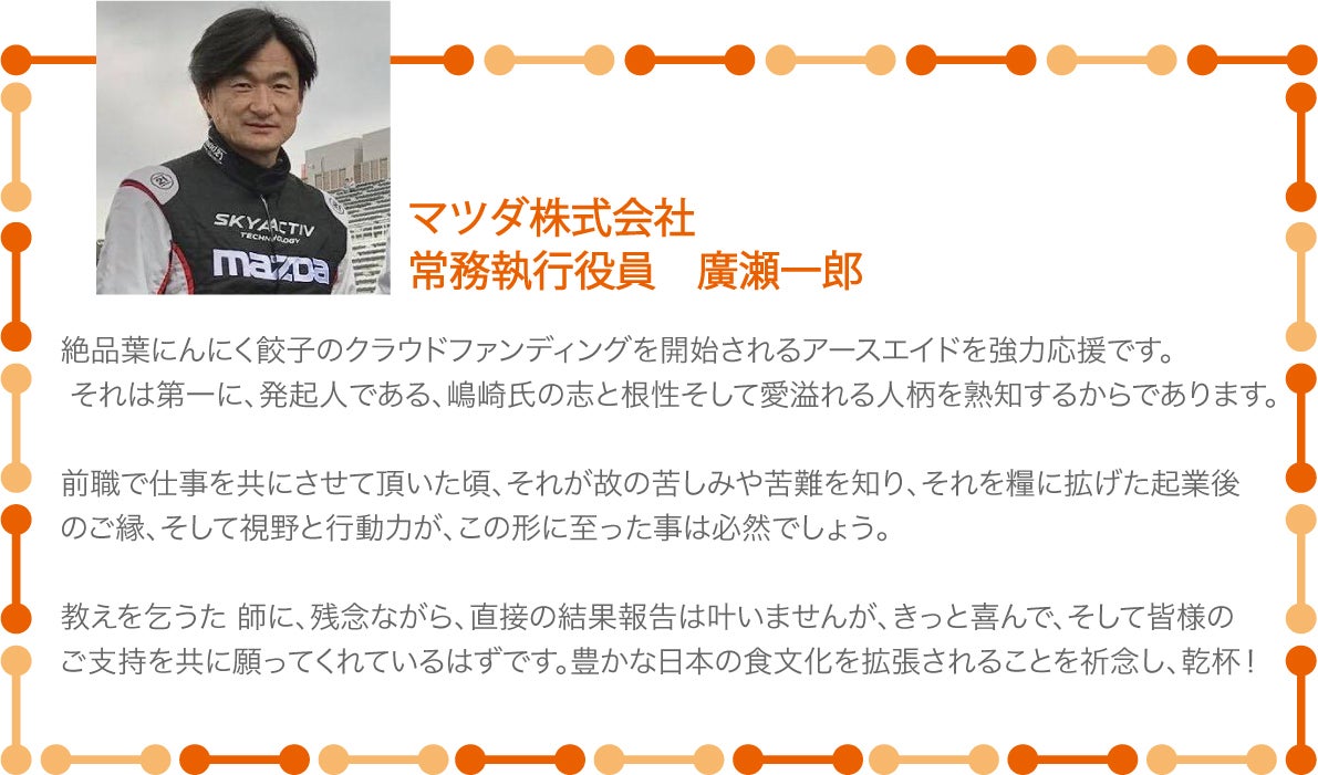 リターンをお送りさせていただきました皆さまからのお声を参考に改善を重ねた結果、当初の予定より遅れてしまったものの製品化、販売を開始することができました!改めましてお礼申し上げます。※アースエイドHP 葉ニンニク餃子販売ページ