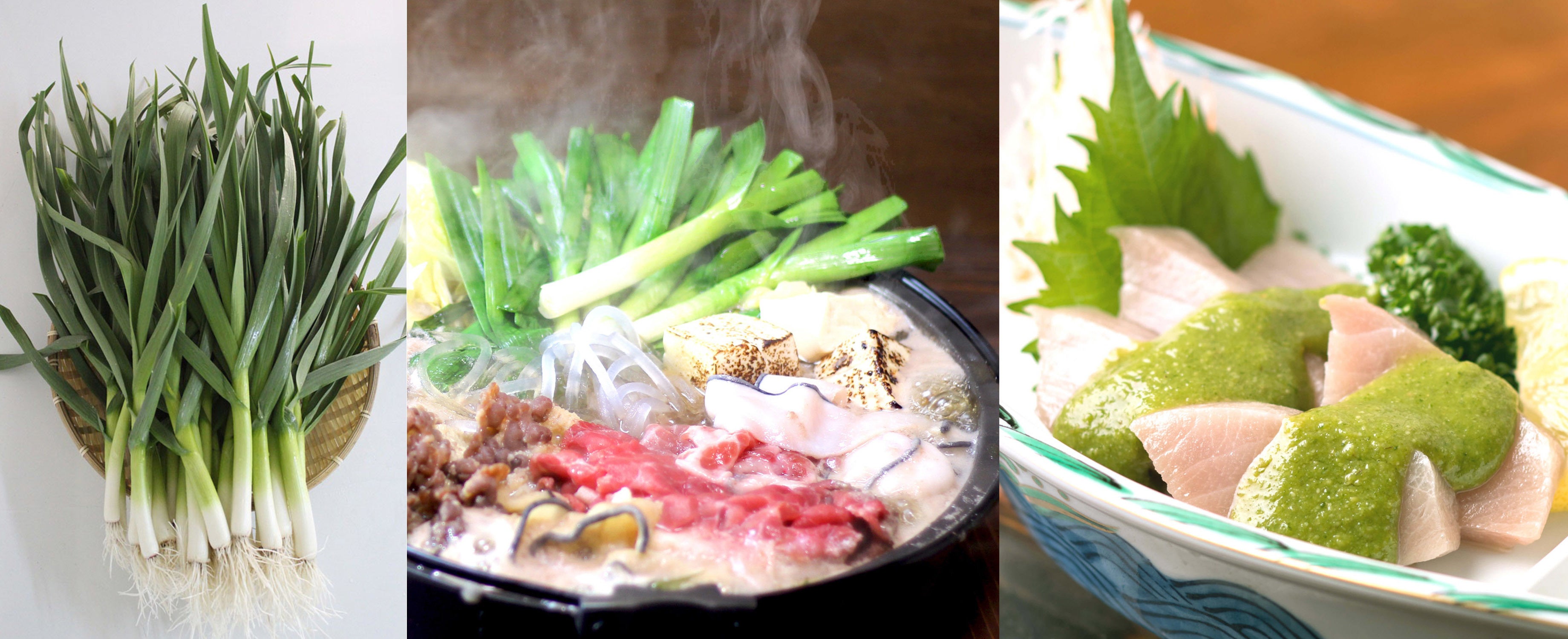 冬の高知に来た人は、葉にんにくの調味料(ヌタ)の鮮やかな緑にびっくりし、そして味にハマります。すき焼きも"葉にんにく"で食べると「もうネギには戻れない」と言う人もいます。