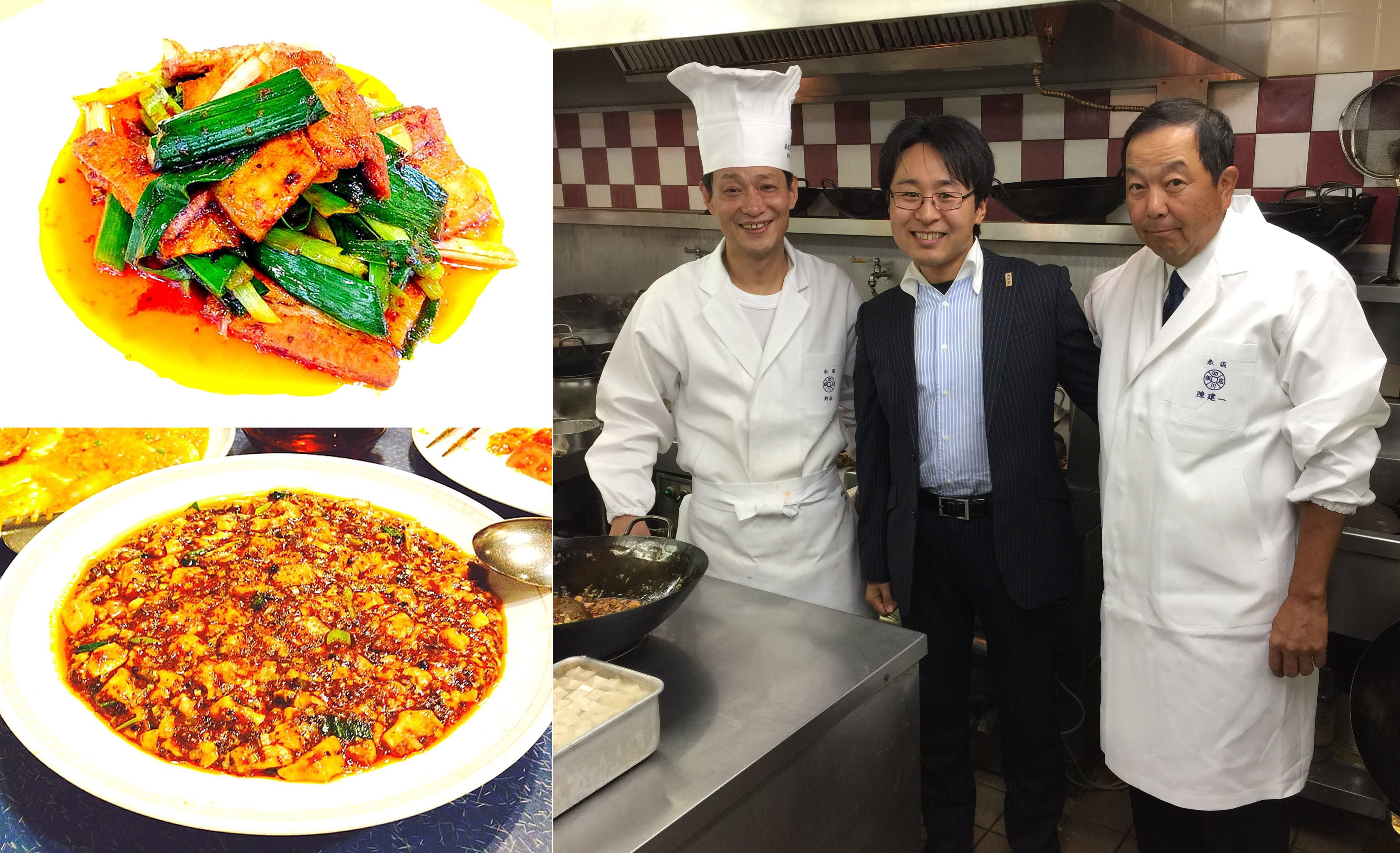 photo: (左)葉にんにく回鍋肉と麻婆豆腐、(右)赤坂四川飯店鈴木料理長、嶋崎、陳建一さん