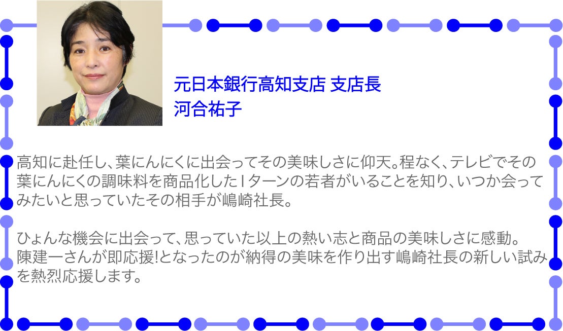きっかけは遡ること4年前、高知県庁の方が陳建一さんへの手土産に当社の葉にんにくを持って行ったところ、"陳さんがその味や香り、歯応えについて絶品!!”と大絶賛し、是非陳さんの赤坂四川飯店でも取り扱わせて欲しいということが始まりでした。