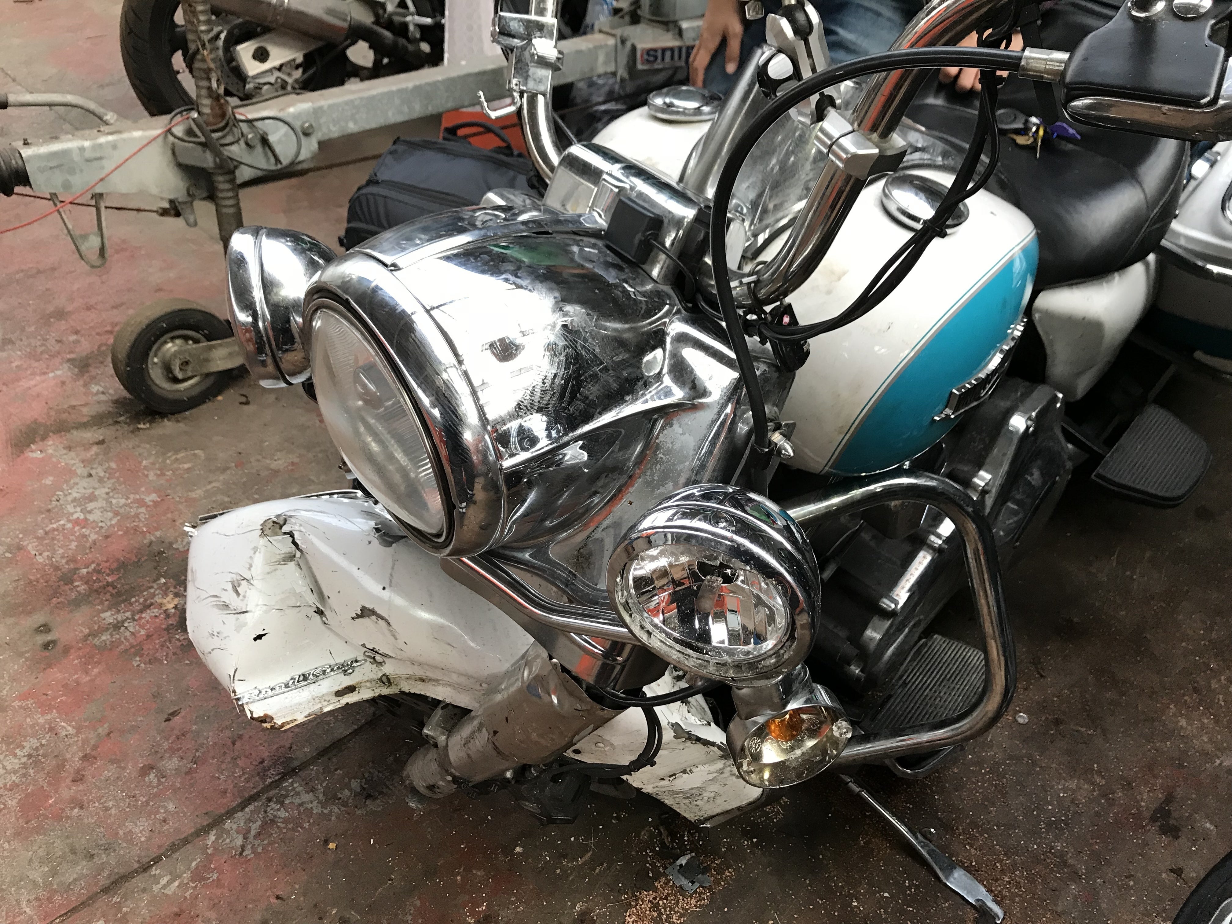旅に出て542日目の夜、スコットランドで正面衝突の大事故に遭い、大怪我を負いハーレーは大破しました。