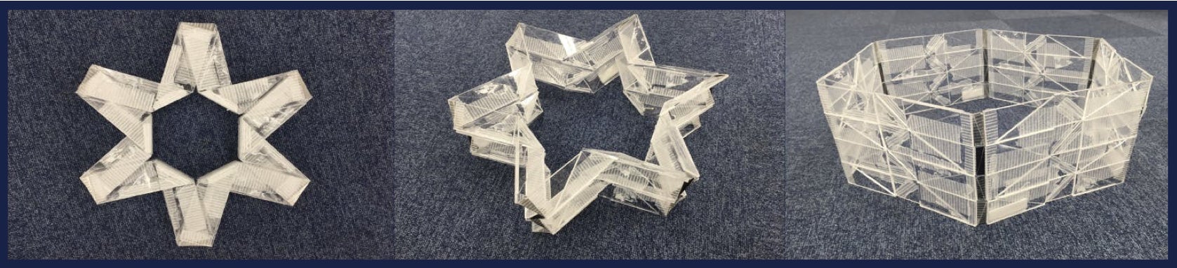 さらに、もとは壁面のみだった構造に特殊な天井面と床面を取り付け、完全な空間を作り出すことにも成功しました。今はまだ折り畳みと展開を手動で行っていますが、将来的には全てを自動化することを目指しています。