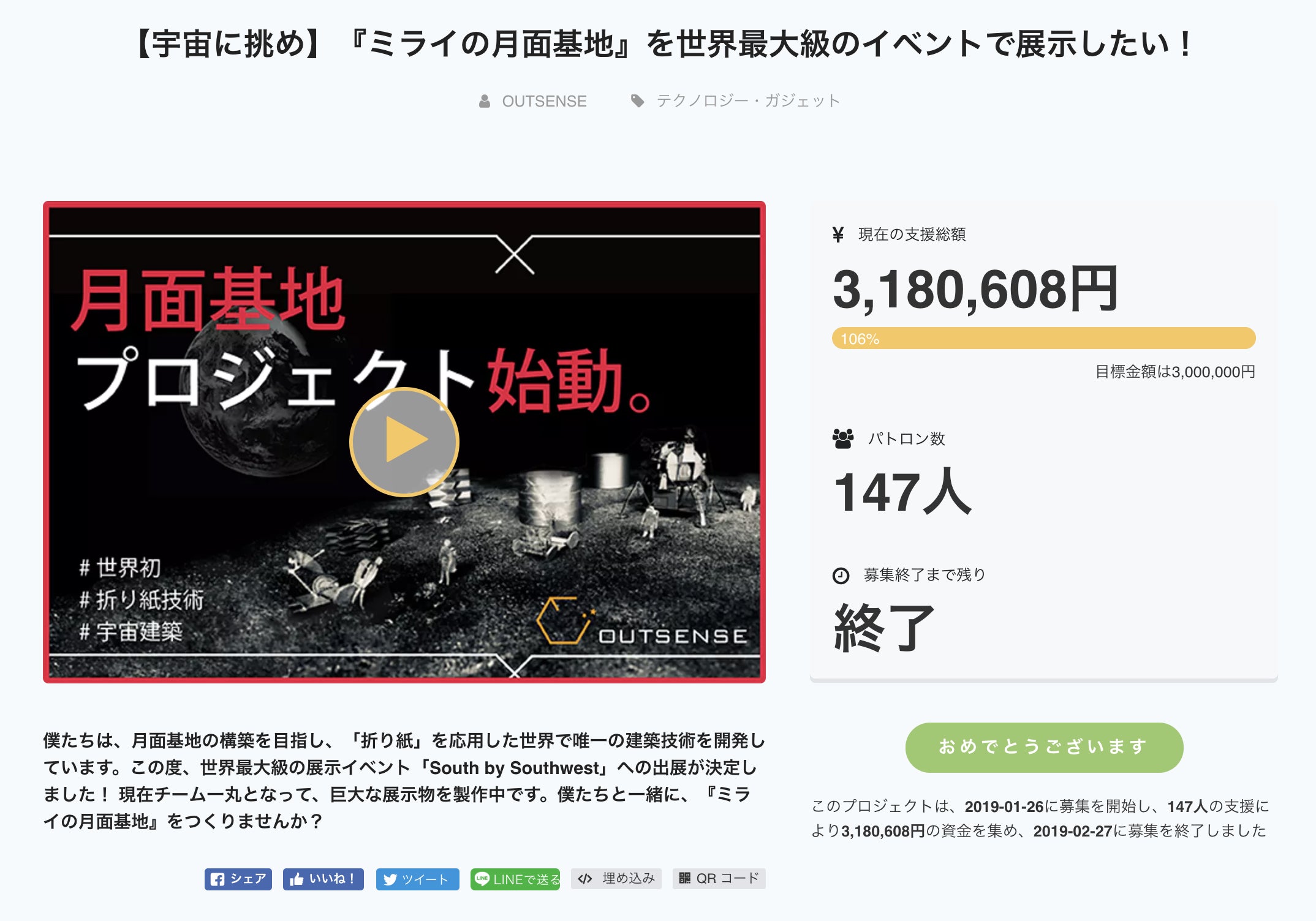 昨日、「【宇宙に挑め】『ミライの月面基地』を世界最大級のイベントで展示したい!」のプロジェクトが、300万円の目標金額を達成し終了いたしましたことをご報告します。