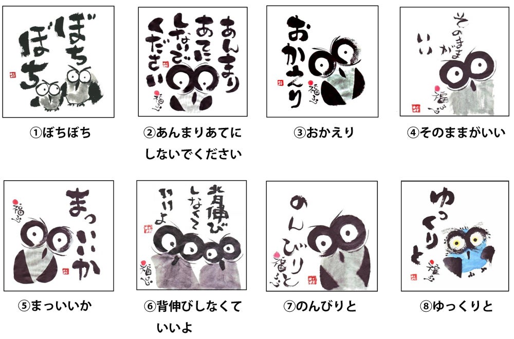 いいださんの作品から、張り詰めた気持ちの人にかけたい言葉を選んで、今回は8種類の絵柄を用意しました。どの福ろうも「頑張りすぎない」ようにゆるーい言葉をかけてきてくれます。
