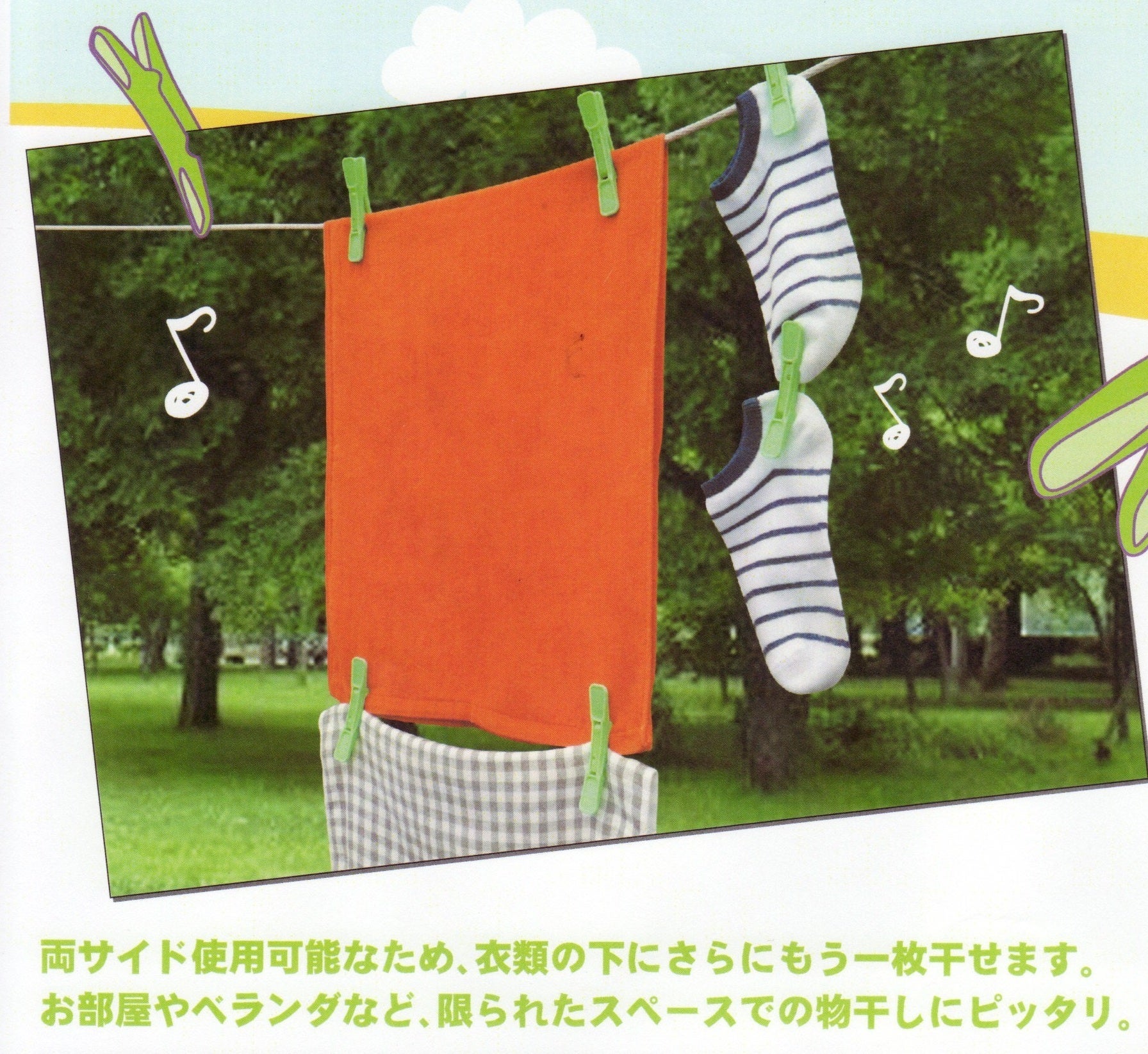 オーストラリア人夫婦が開発した両サイドがいっぺんに挟めるクリップ(洗濯バサミ)で洗濯物の下に次の洗濯物がどんどん連結できて横のスペースが節約できます。