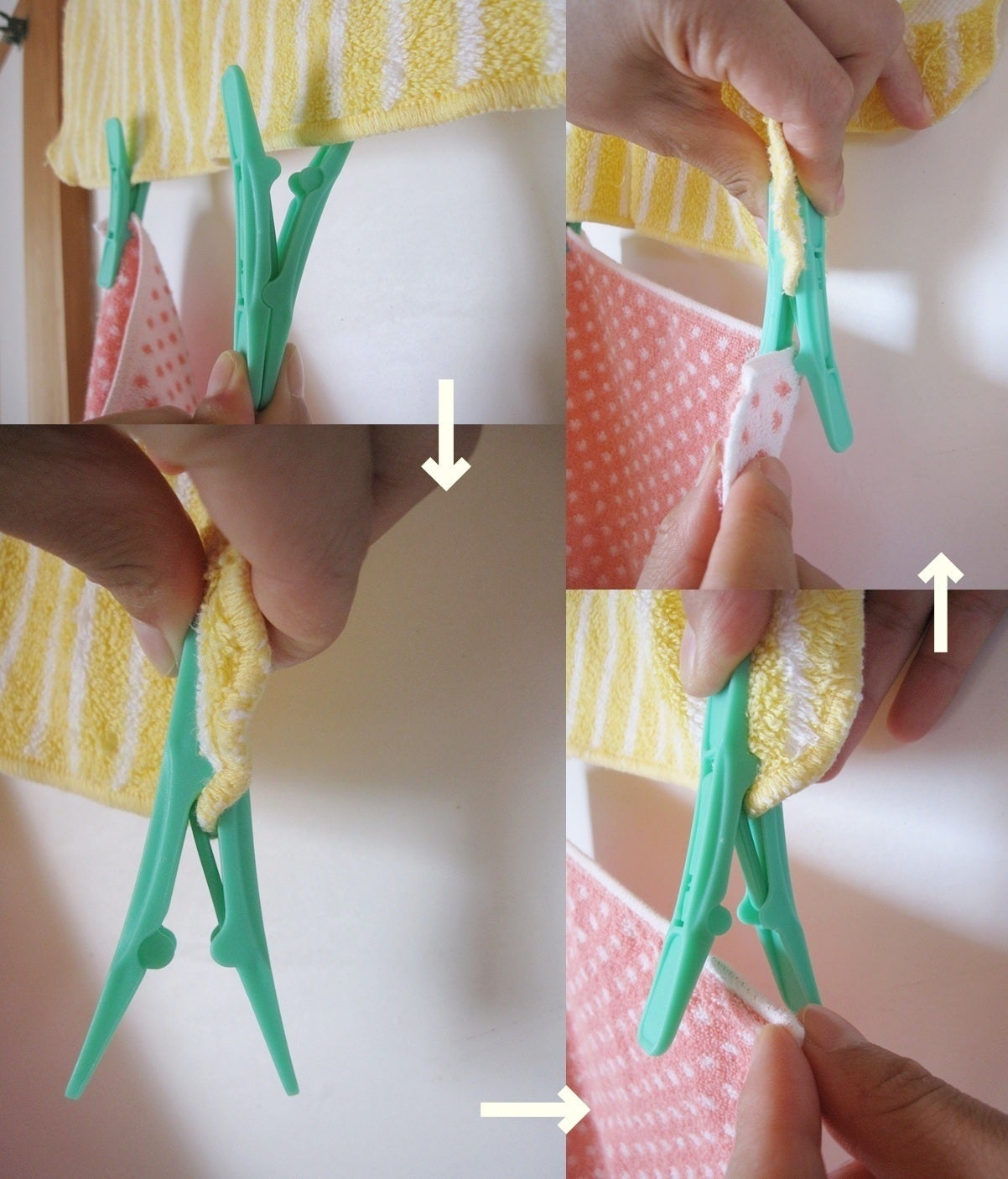 小物の下にまた小物をつなげて干すことが可能!両サイド使用可能な洗濯クリップだから、衣類の下にさらにもう一枚干すことができるんです。つまり、縦のスペースを生み出して有効利用できちゃうです。もちろん、空いた角ハンガーのピンチには、ほかの洗濯物を干しちゃってOK。ちょっとしたことだけど、これが“ある”と“ない”では、一回に干せる洗濯物の量がぜんぜん違います!