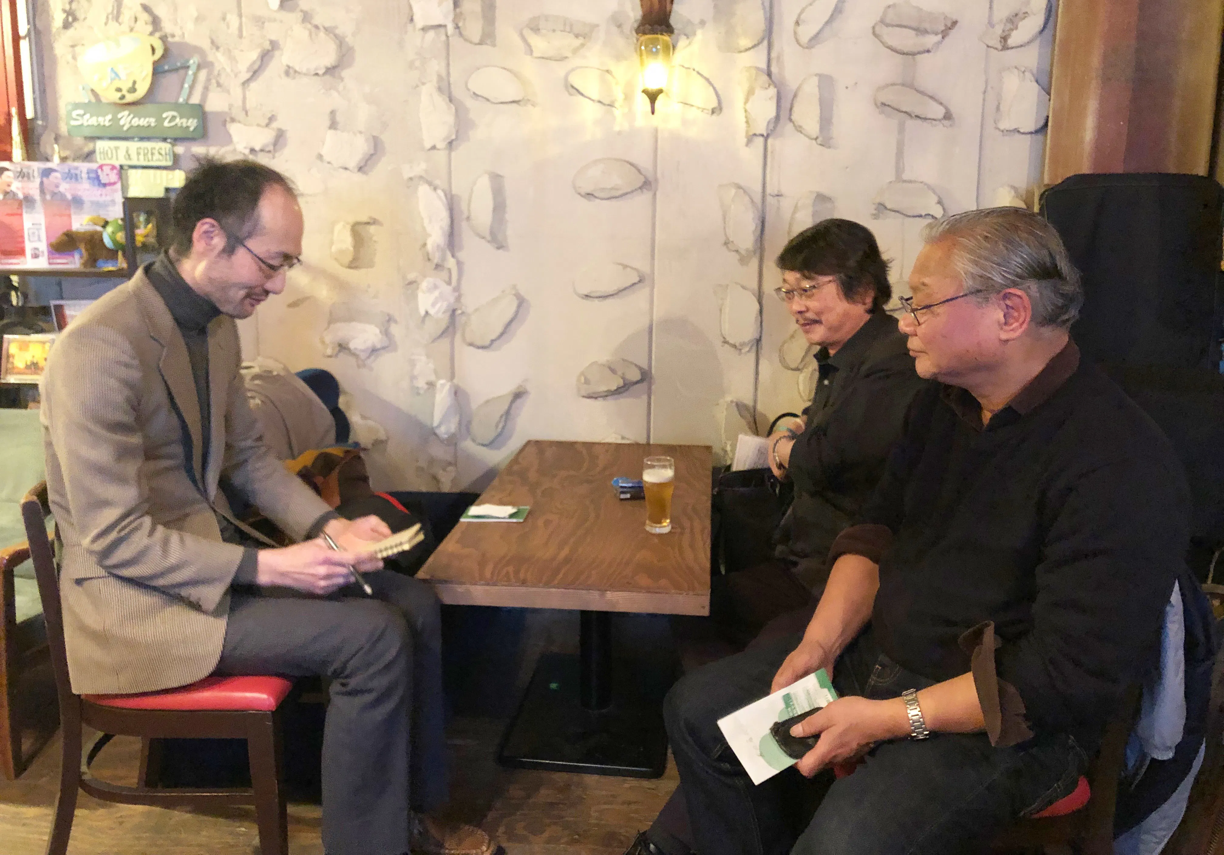 「かば」に登場する教師たちのモデルであり、故 かば先生の同僚だった丸山敏夫先生(右側 手前)、古川正博先生(右側 奥)も加わり、当時の話を興味深いようすで取材されていました。