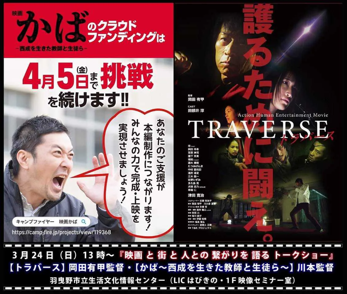 場所は大阪府羽曳野市 LICはびきの にて川本監督が出演、話題の本格空手映画「TRAVERSE」の岡田有甲監督と「映画と街と人との繋がり」をテーマにトークショーも行われる予定です。