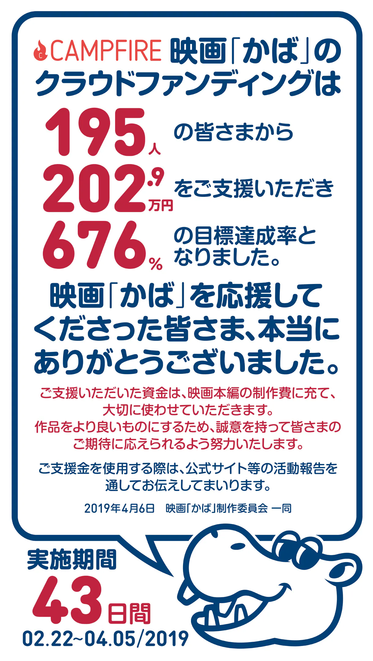 6週間という短い期間であったにも関わらず、たくさんの方が応援してくださいました。皆さまからの温かいご支援のおかげで映画「かば」本編制作の実現に大きく近づくことができました。