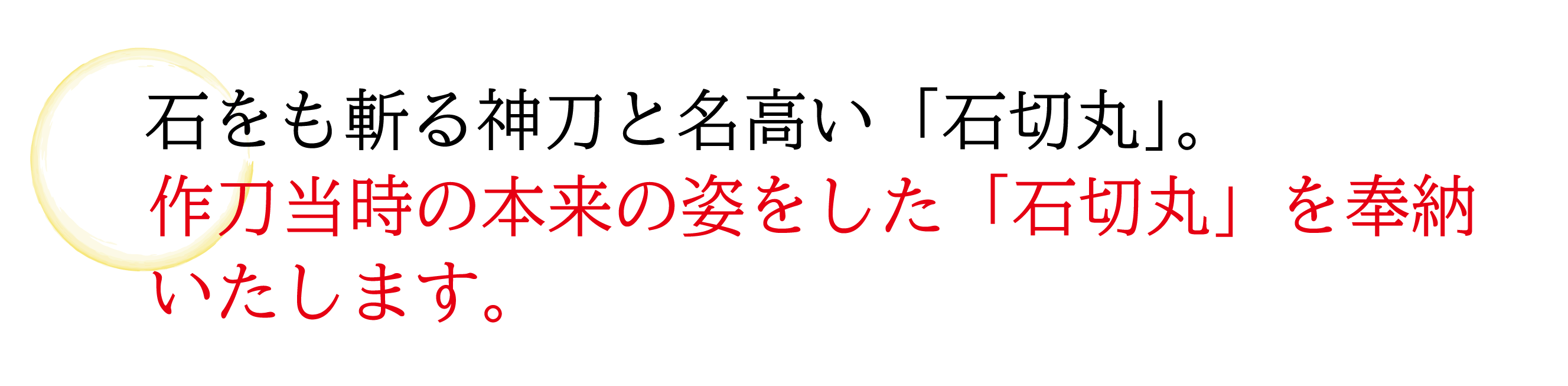 奉納する刀剣は、石をも斬る神刀と名高い「石切丸」。ただし、現在所蔵している石切丸は、作刀された平安時代から現在までに時々研磨され、その姿は作刀当時のままではありません。この度、作刀当時の本来の姿をした石切丸に近づけます。