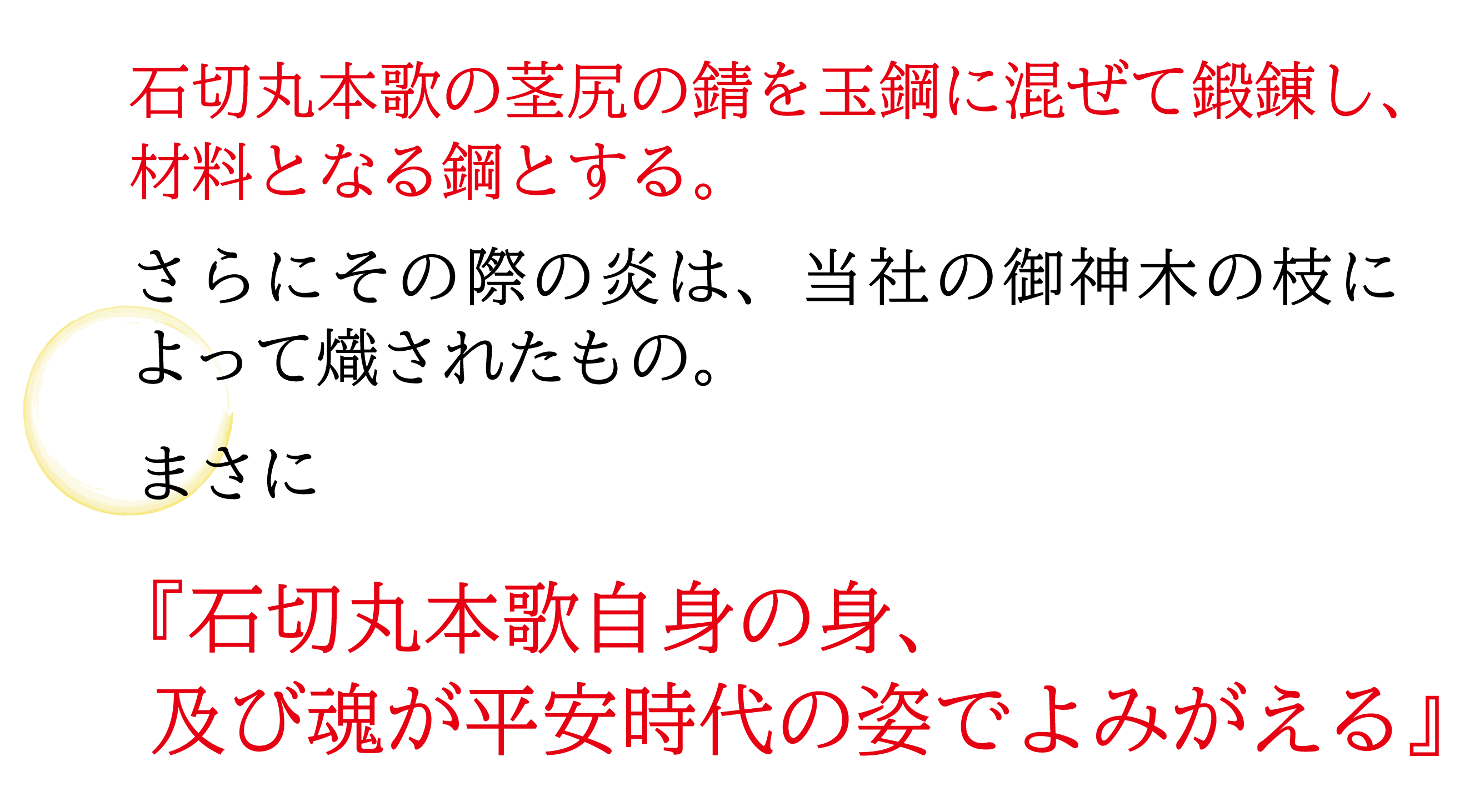 特に今回の作刀にあたり、石切丸本歌(いしきりまるほんか)の茎尻(なかごじり)の錆と和釘(わくぎ)と玉鋼(たまはがね)を材料として使用致します。また火造りは当社の御神木を松炭に混ぜ使用いたします。まさに『石切丸本歌自身の身、及び魂が平安時代の姿でよみがえる』こととなり、これまでに類を見ない取り組みです。