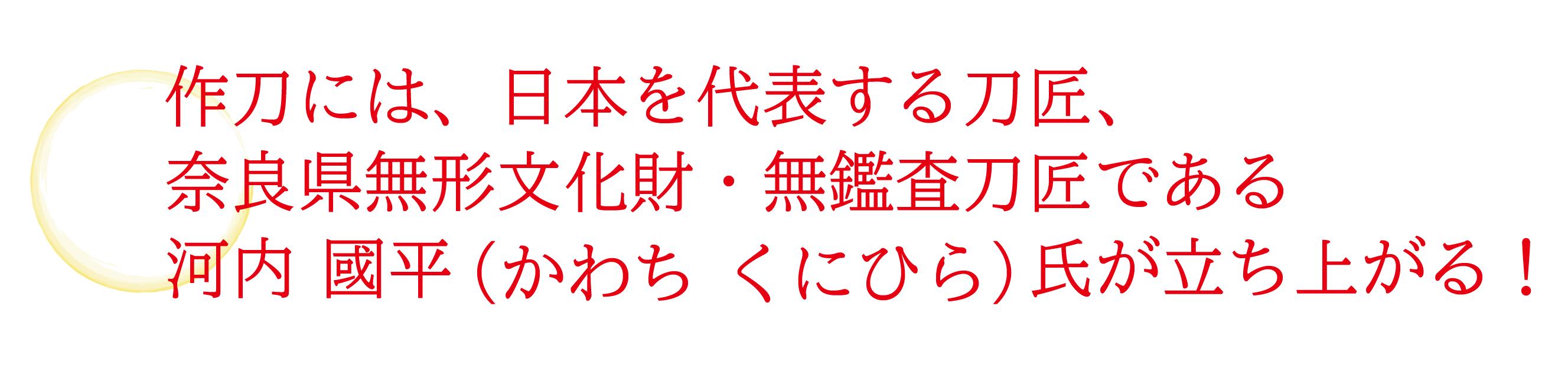作刀をするのは、日本を代表する刀匠である、奈良県無形文化財・無鑑査(むかんさ)刀匠である河内 國平(かわち くにひら)氏です。河内刀匠のお父様、第14代河内守 國助(かわちのかみ くにすけ)は当社の奉納刀の管理を行っておりました。その御子息である河内刀匠は、幼少期を石切劔箭神社の参道で過ごしている御縁ばかりでなく、平成26年に最も刀匠として権威のある「正宗賞」を受賞され、最近でも平成の名工大賞を受賞される当代最高の技量を持ち、奈良に住まいされていることから、当社として依頼するにあたり河内刀匠以外には考えられないと思い、作刀をご依頼しております。