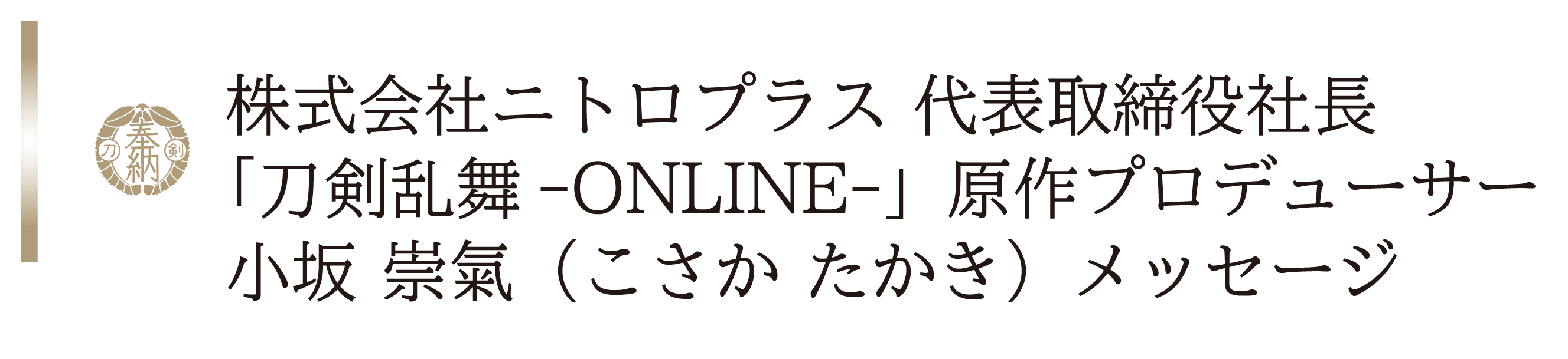 ゲームやアニメを制作している株式会社ニトロプラスの小坂 崇氣(こさか たかき)と申します。私は刀剣を題材にした「刀剣乱舞(とうけんらんぶ)-ONLINE-」というゲームの原作プロデューサーをしております。