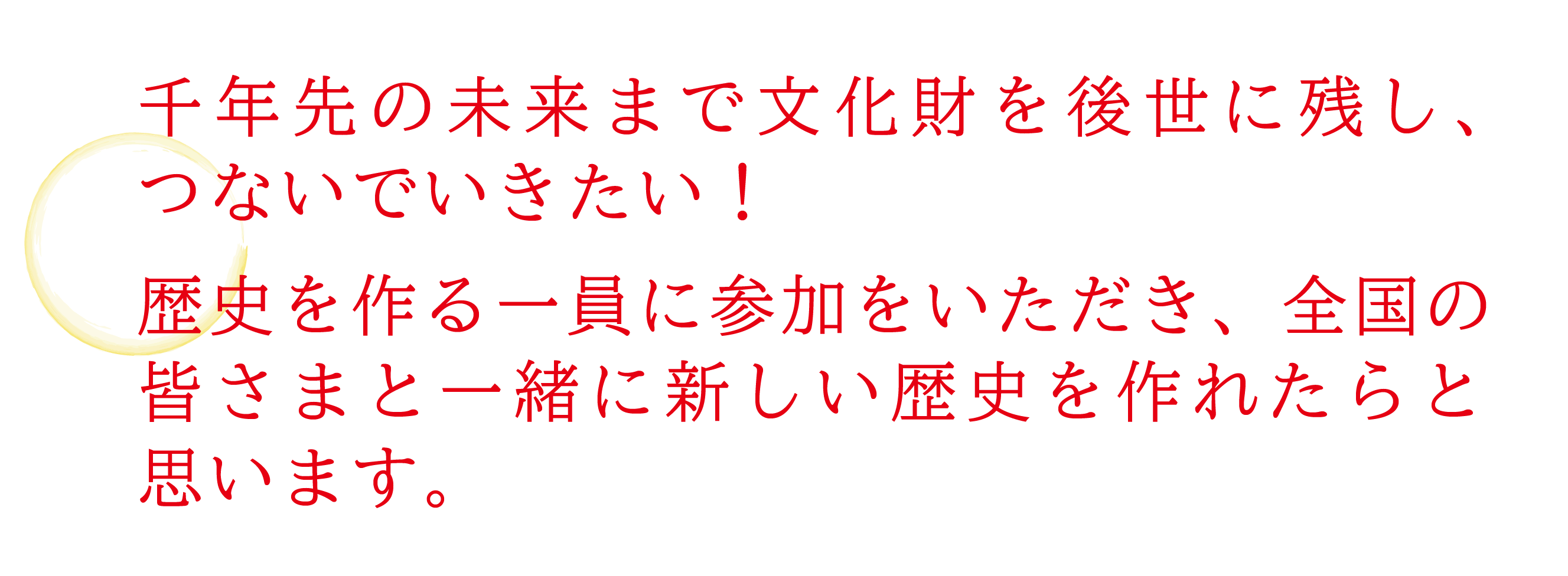 全国の皆様と一緒に奉納を行い、文化財を後世につないでいくとともに、新しい歴史を作ってまいりたいと思います。