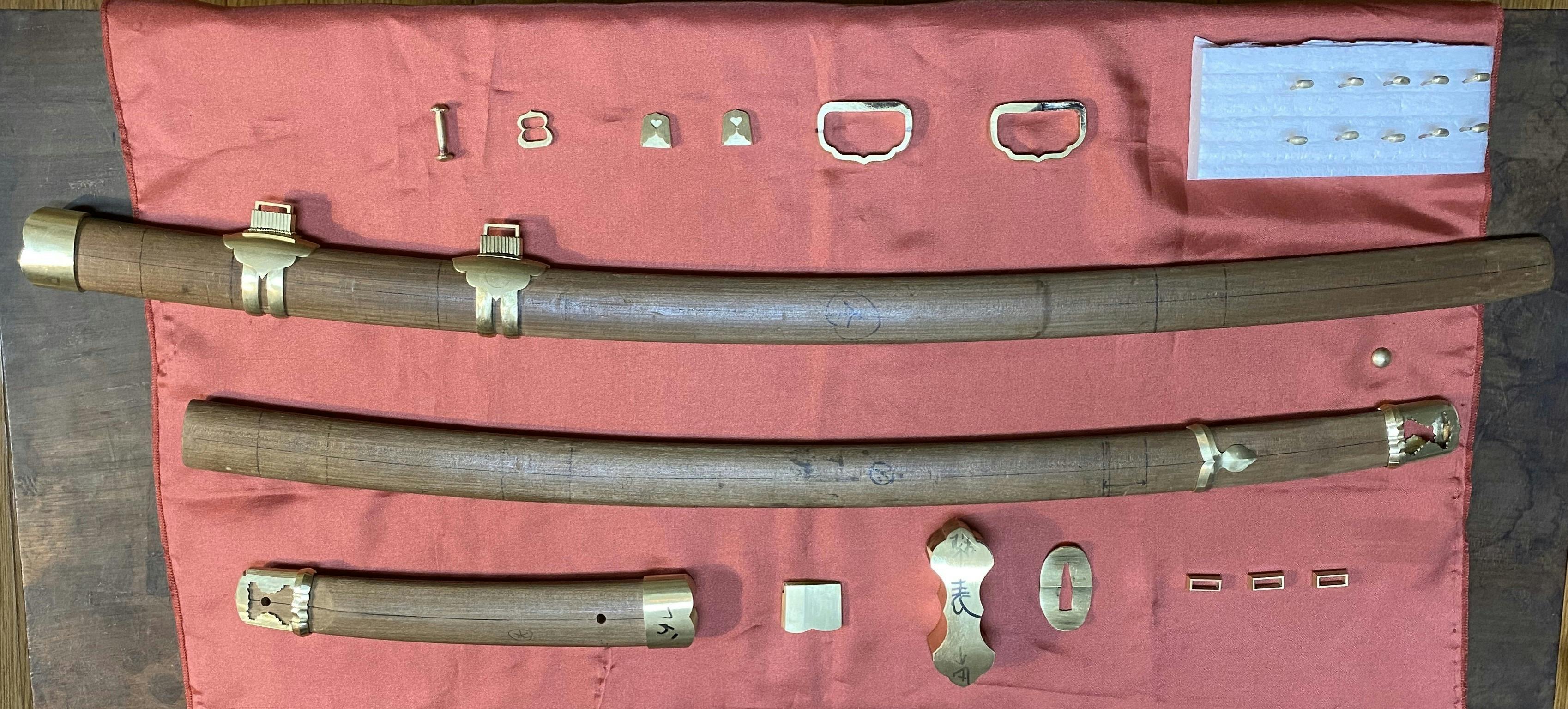 画像の白鞘に大小とありますが、金具を仮に付けてみる都合上二振りになっているだけで、実際のものではありません。