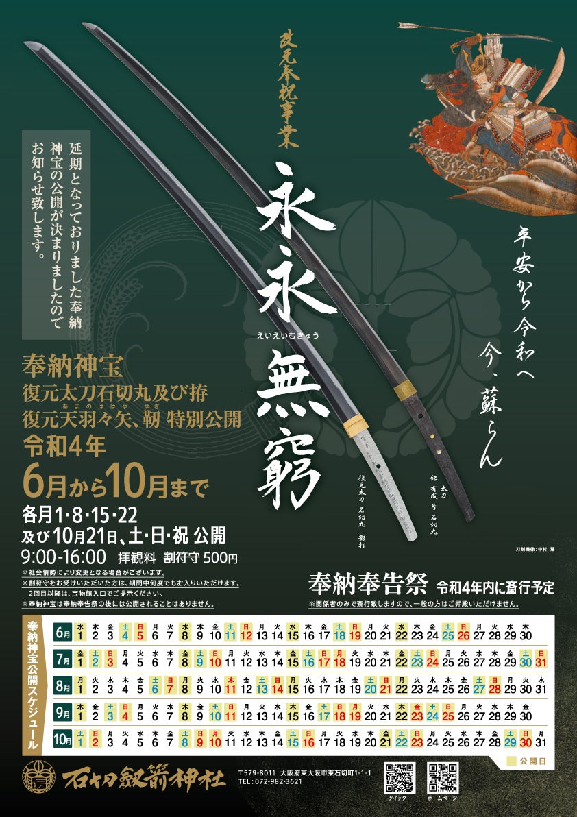 取り急ぎのご報告となりますが、再延期となっておりました改元奉祝事業 奉納神宝公開「永永無窮」の日程が決まりましたのでお知らせ致します。