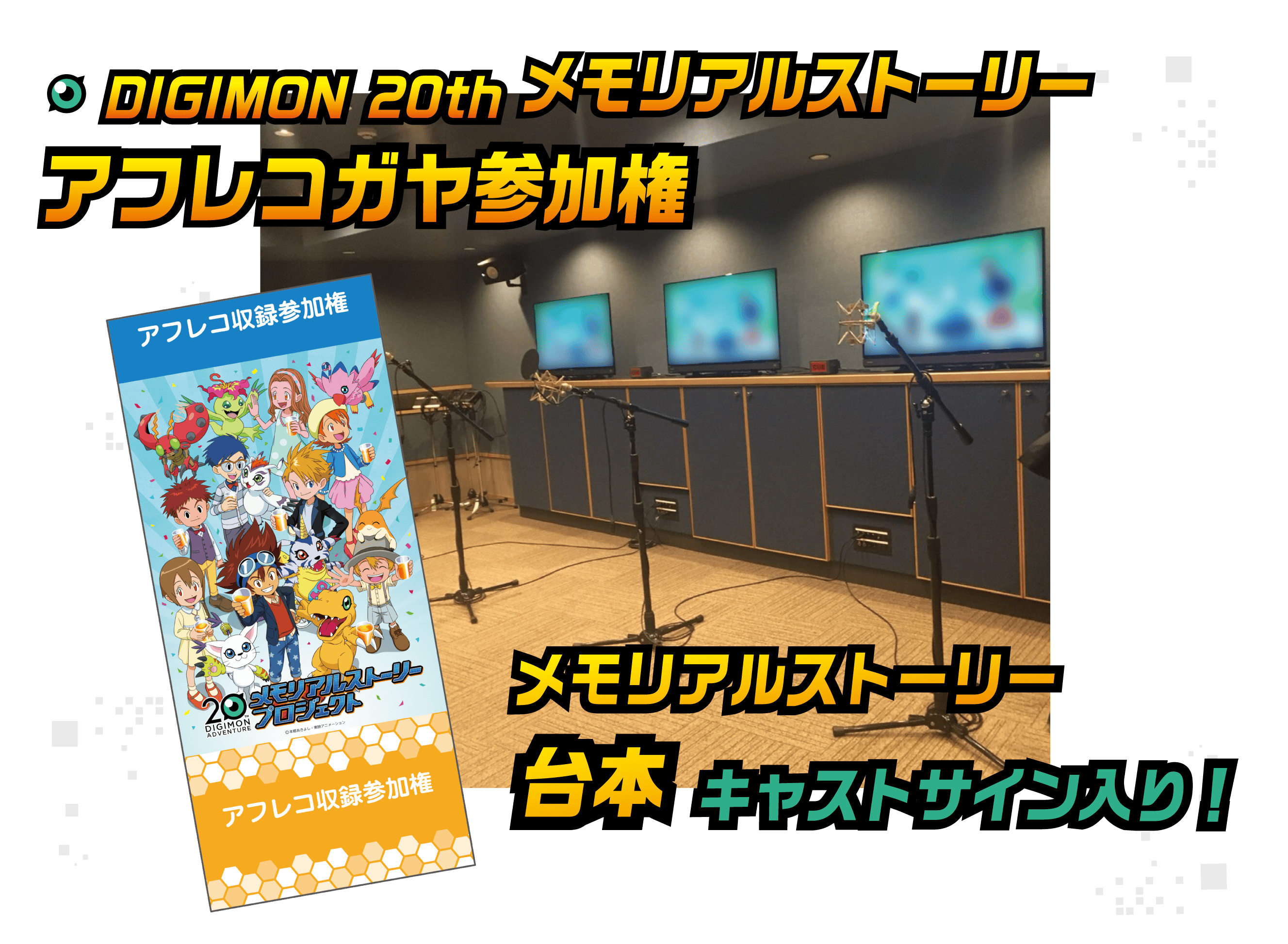 劇場版『デジモンアドベンチャー LAST EVOLUTION 絆』では描ききれなかった物語を映像化する「デジモンメモリアルストーリー」のアフレコにガヤとして参加ができる権利が登場!収録の見学も可能!さらにキャストのサイン入り台本をお渡しいたします。