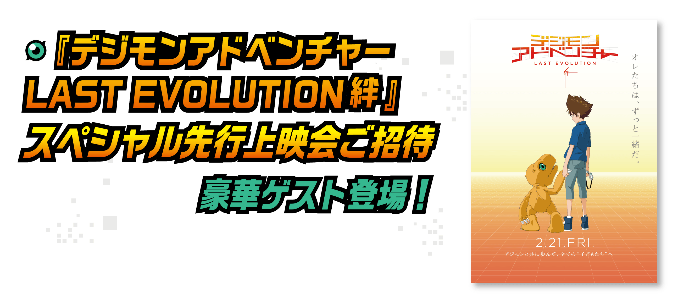 『デジモンアドベンチャー LAST EVOLUTION 絆』のスペシャル先行上映会にご招待。2020年2月21日(金)の公開に先駆けて映画をご覧頂けます。豪華ゲストによるトークショー付き。