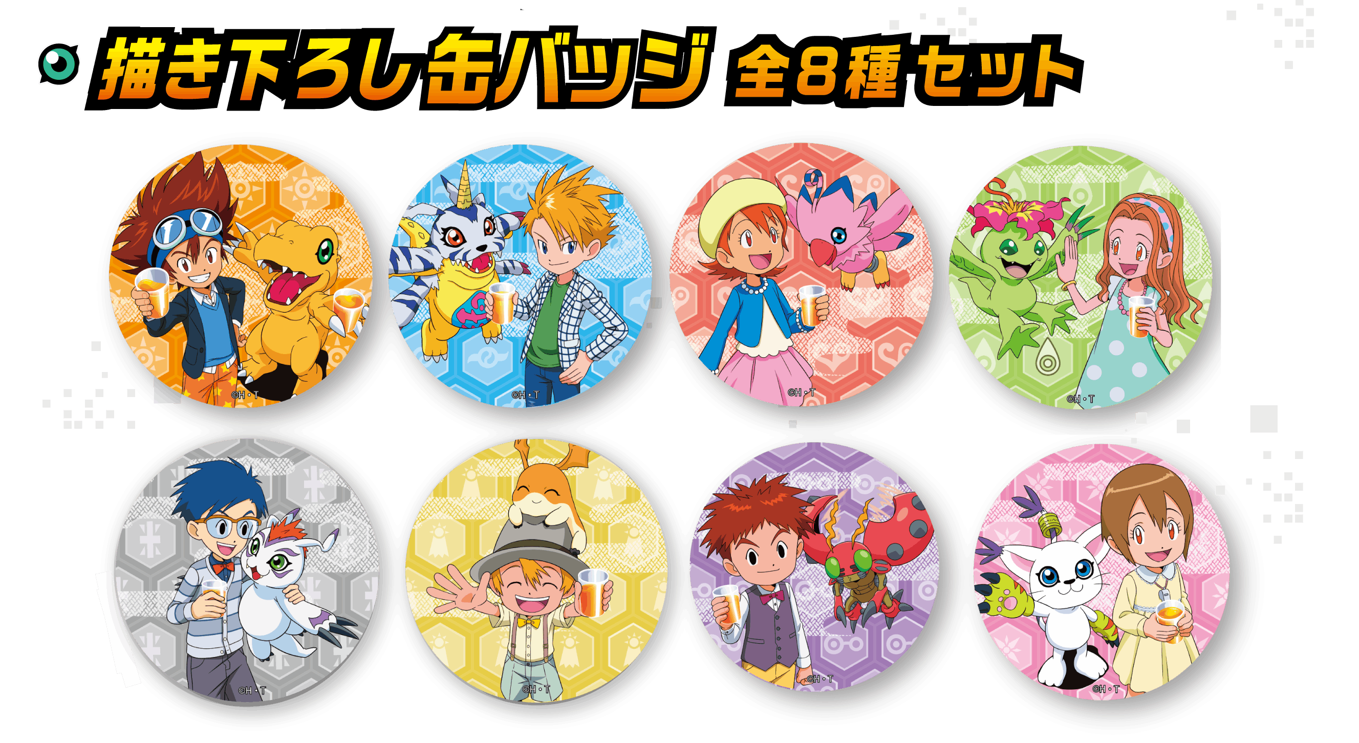 本プロジェクトのために描き下ろしたビジュアルを使用した缶バッジ(8種セット)が登場。