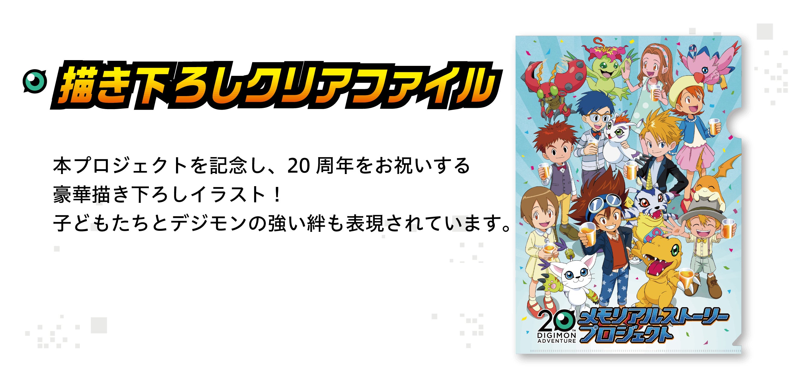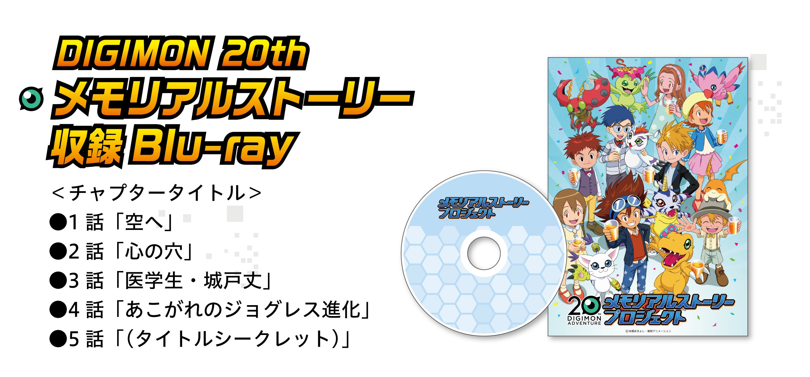 デジモン20th メモリアルストーリーは、新作劇場版『デジモンアドベンチャー LAST EVOLUTION 絆』のサイドストーリーや前日譚など劇場本編では描ききれなかった映像や、大人になった彼らとデジモンたちの日常などを描いた特別な物語を短編アニメーションとして5作品制作予定です。