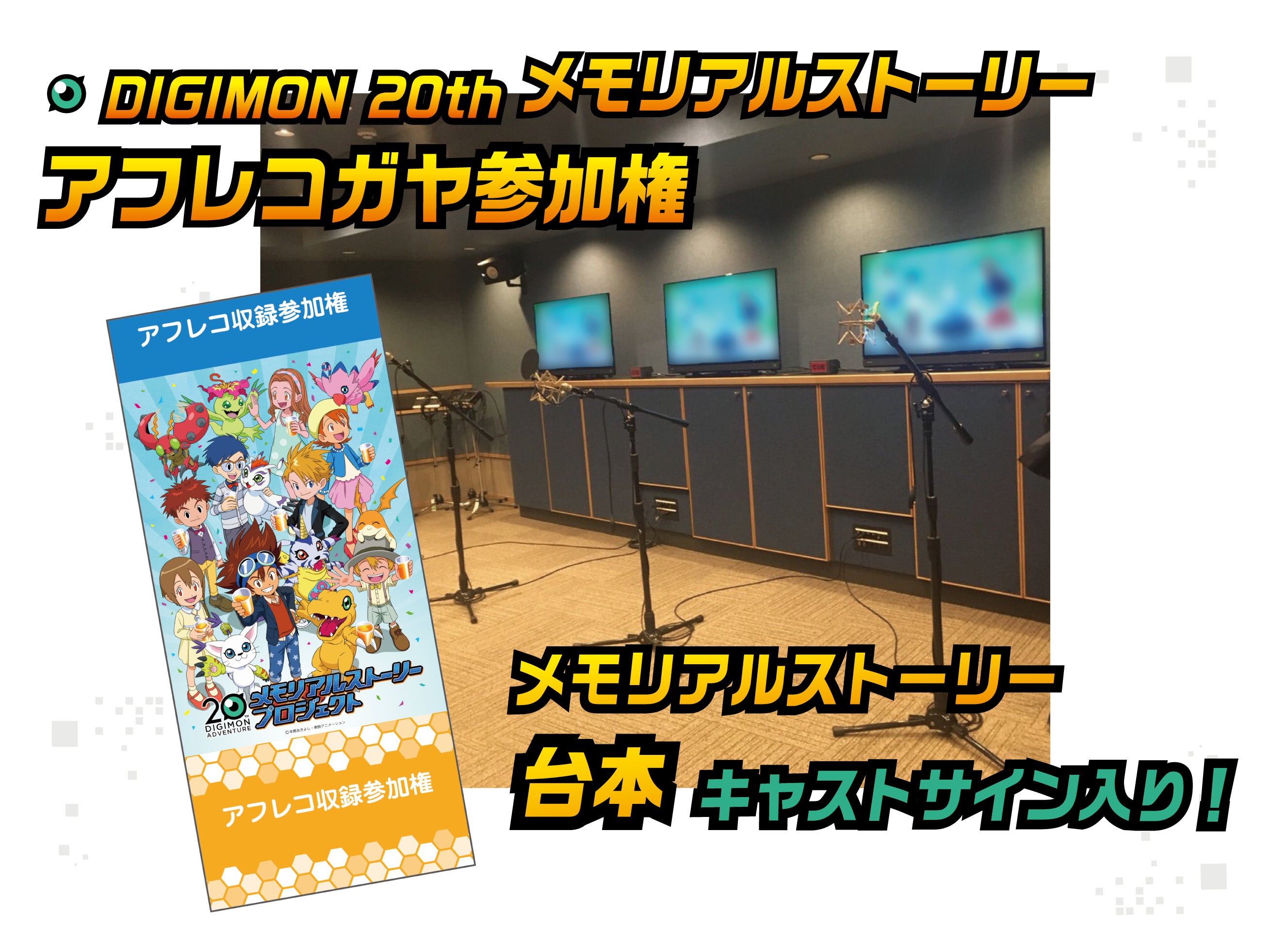 劇場版『デジモンアドベンチャー LAST EVOLUTION 絆』では描ききれなかった物語を映像化する「デジモンメモリアルストーリー」のアフレコにガヤとして参加ができる権利が登場!収録の見学も可能!さらにキャストのサイン入り台本をお渡しいたします。