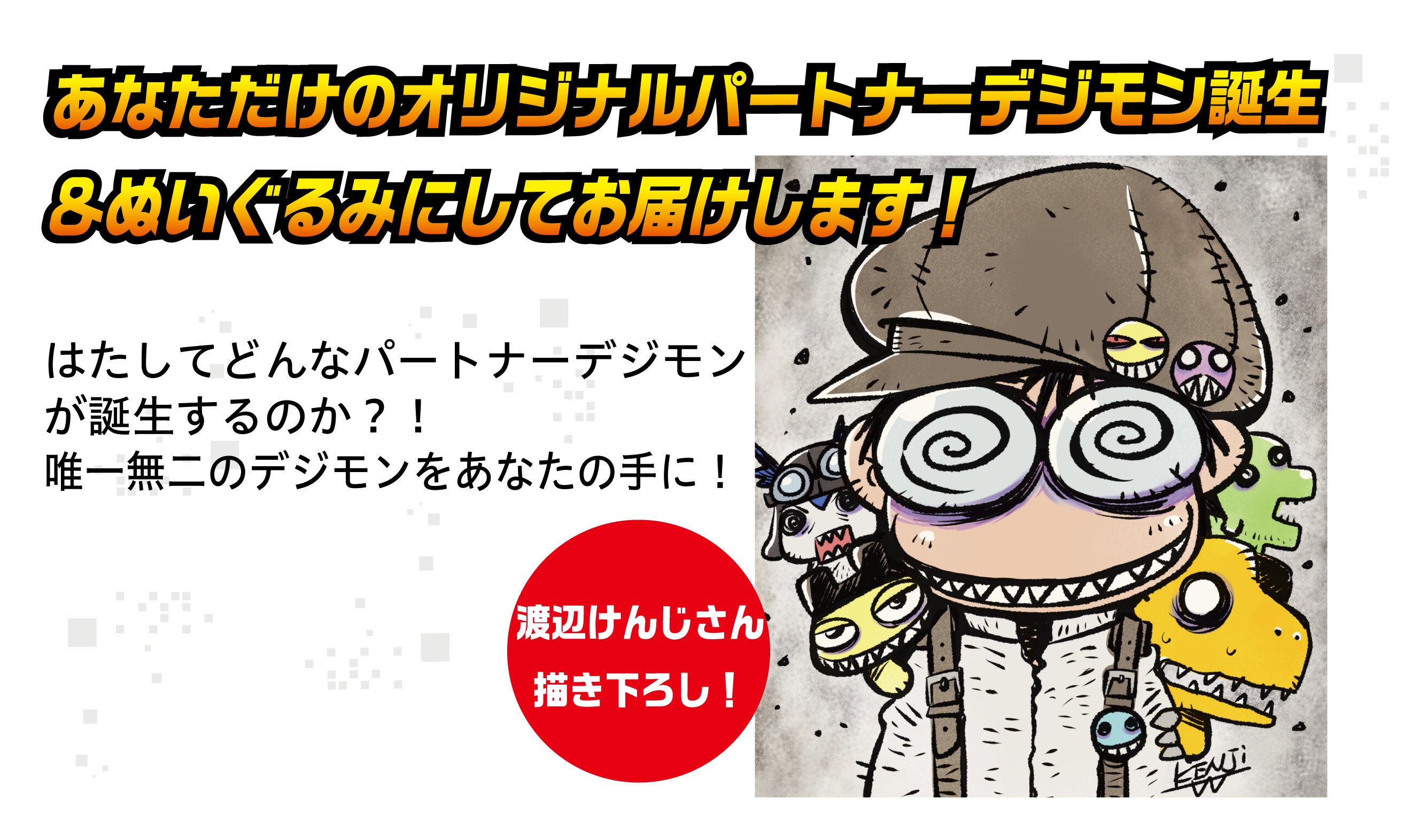 デジモンキャラクターデザイナーの【渡辺けんじ】さんがあなただけのオリジナルパートナーデジモンを描きます!さらにそのデザインをぬいぐるみにしてお届けいたします!