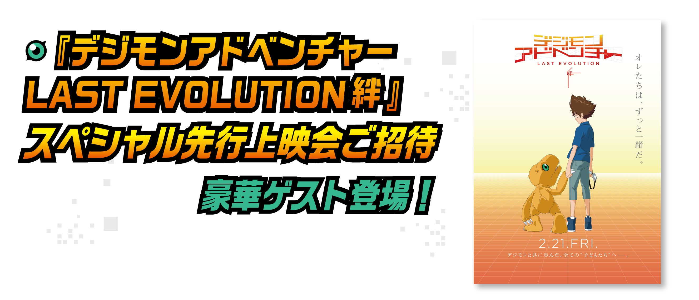 『デジモンアドベンチャー LAST EVOLUTION 絆』のスペシャル先行上映会にご招待。2020年2月21日(金)の公開に先駆けて映画をご覧頂けます。豪華ゲストによるトークショー付き。