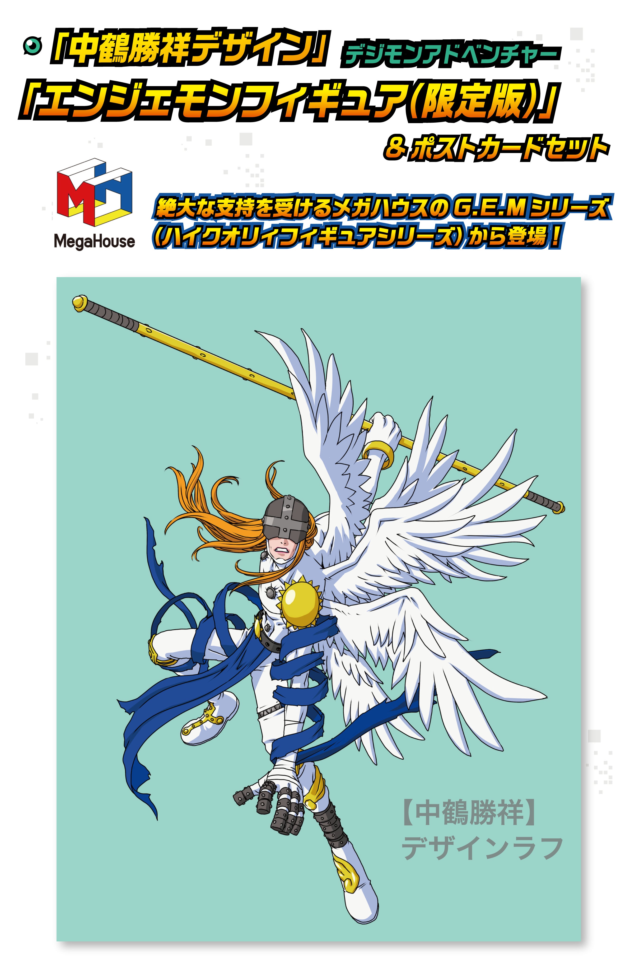 本プロジェクトだから実現したスペシャルリターン。アニメ『デジモンアドベンチャー』のキャラクターデザインを務める【中鶴勝祥】さんが本プロジェクトのために特別にデザインした「エンジェモン」のイラストを元にフィギュア化。数々のデジモンシリーズフィギュアでもおなじみの【メガハウス】が展開するハイクオリティフィギュアブランド「G.E.Mシリーズ」での制作となります。中鶴さんのデザインイラストを使用したポストカードも付属いたします。