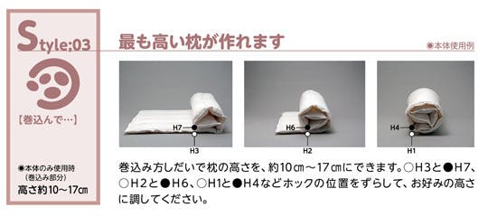 枕の高さは個人の好みによるところが大きいですが、体型や体格、加齢による湾曲の個人差、そして後頭部の形状によって大きく異なります。                                           この首枕は、折り方や丸め方の組み合わせによって、頸部(首)を乗せる高さを自由に変えることができます。睡眠姿勢が立位に近づき、最適な頸椎角度で寝られると思います。