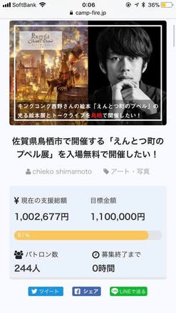 お笑い芸人キングコングの西野亮廣さんが昨年の10月に出版した絵本です。昨年12月に東京の表参道で「光る絵本展」を無料開催する為に、クラウドファンディングを開催。リターンとして「光る絵本展を開催する権利」という物がありました。そのリターンを昨年の12月に購入して、権利を得ています。その時の西野亮廣さんの行ったクラウドファンディングの支援者数は6000人、支援総額は4600万超えして、メディアでも取り上げられました。