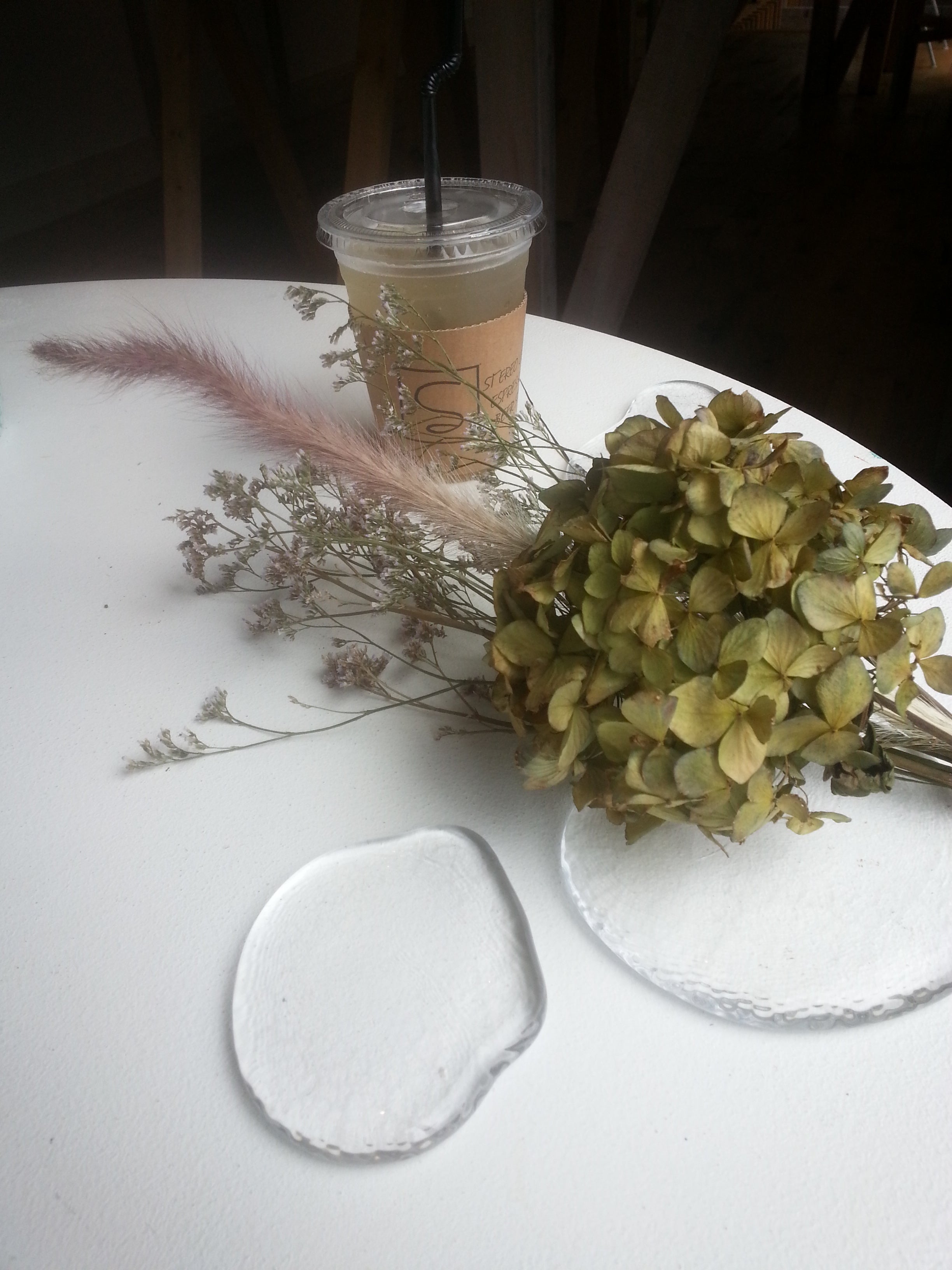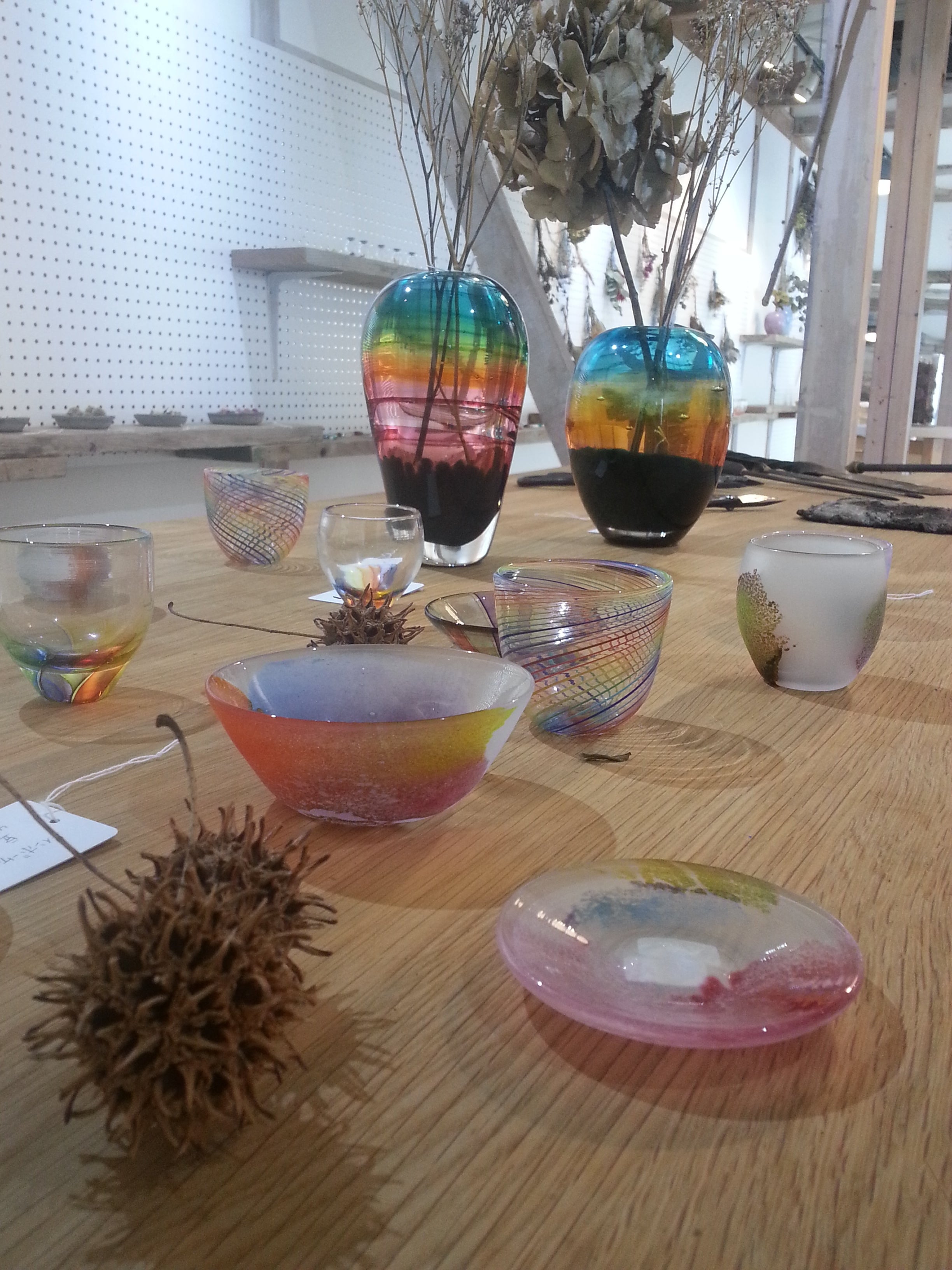 福岡でのお花屋さんとのコラボをコーヒーショップで。2016年 湊久仁子吹きガラス展「+α=∞」(大阪市中央区 aiGallery)