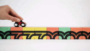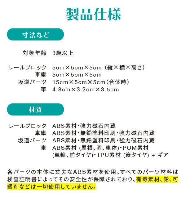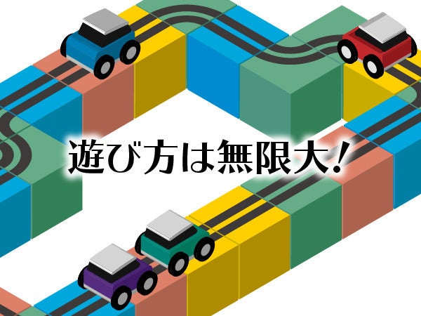 レールブロックを自由に組み合わせて車を走らせるおもちゃです。仕組み自体は単純で小さなお子様でも理解しやすい玩具です。