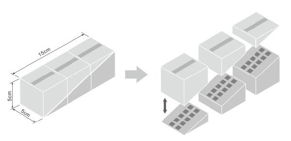▼「坂道パーツ」には3つのサイズがあり、積み重ねると四角ブロックのサイズと同じになります。坂道パーツを組み合わせることで「立体交差」のコースも作れますし、「ジャンプ台」にもなります。