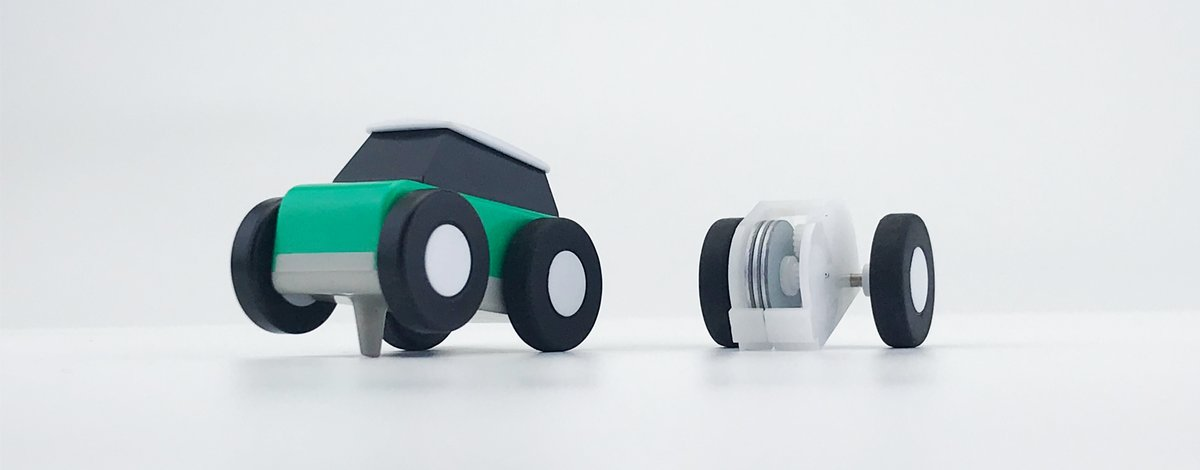 車の設計にもこだわりがあり、ぜんまい式などの様々なプロトタイプを検証し、慣性力で走る仕組みを採用しました。こちらは操作が簡単なため、大人でも子どもでも楽しめます。