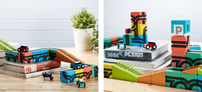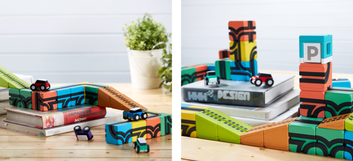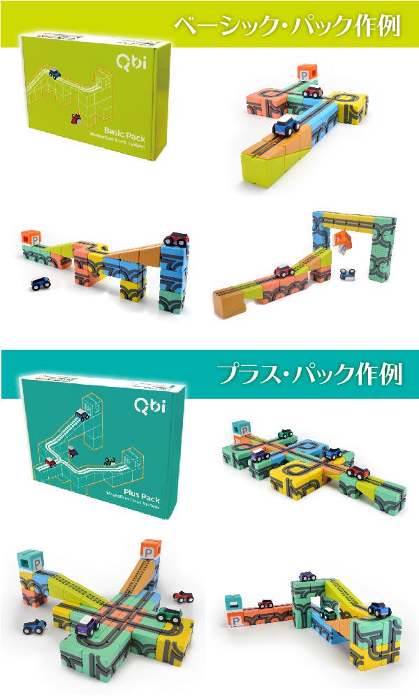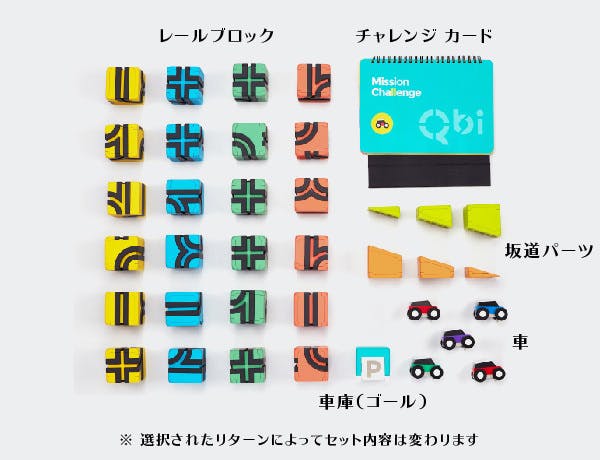 Qbi Toyはコースを作るためのレールブロック・坂道パーツ・車庫、コース上を走る車、チャレンジ カードで構成されています(選択されたリターンによってセット内容は変わります)。