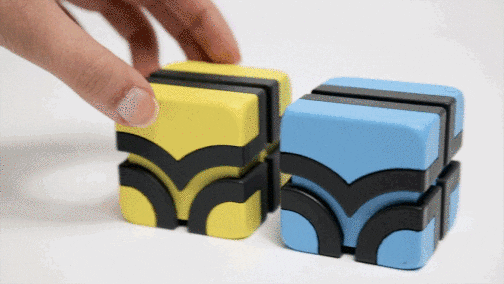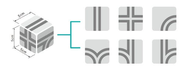▼立方体の「レールブロック」。ブロックの6つの面に掘られた溝を組み合わせて様々なコースを作れます。