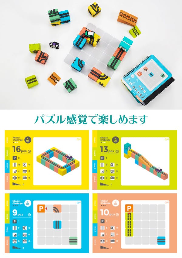 Qbi Toyには「チャレンジ カード」がついています。チャレンジ カードに書いているコースを決められたブロックで作ってみましょう。パズルを解く楽しさをお子様に体験して頂けます。一人遊びにも対応しますし、お友達と協力して解決することでコミュニケーション能力を身につけることができます。